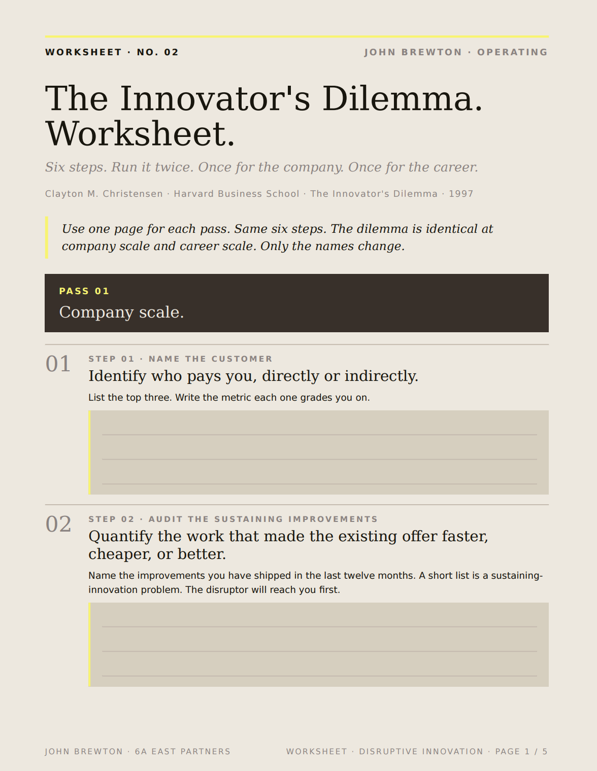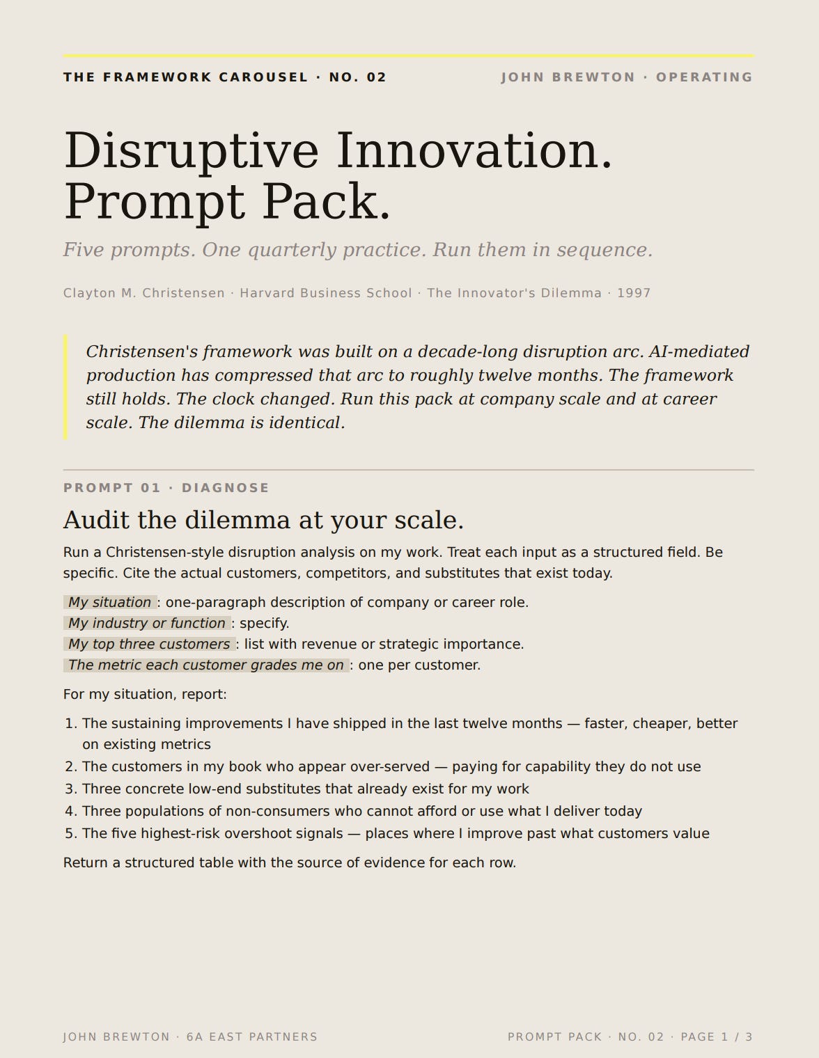 The combination converts an idea you already know into a practice you actually run and build from. Christensen wrote the book twenty-nine years ago. The reason the framework still gets cited is that the underlying logic is correct. The reason most readers do not act on it is that the framework was written as an analytical instrument, not as an operating methodology. These two assets are my attempt to help you close that gap.