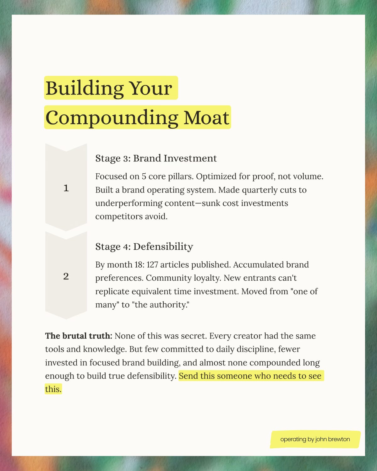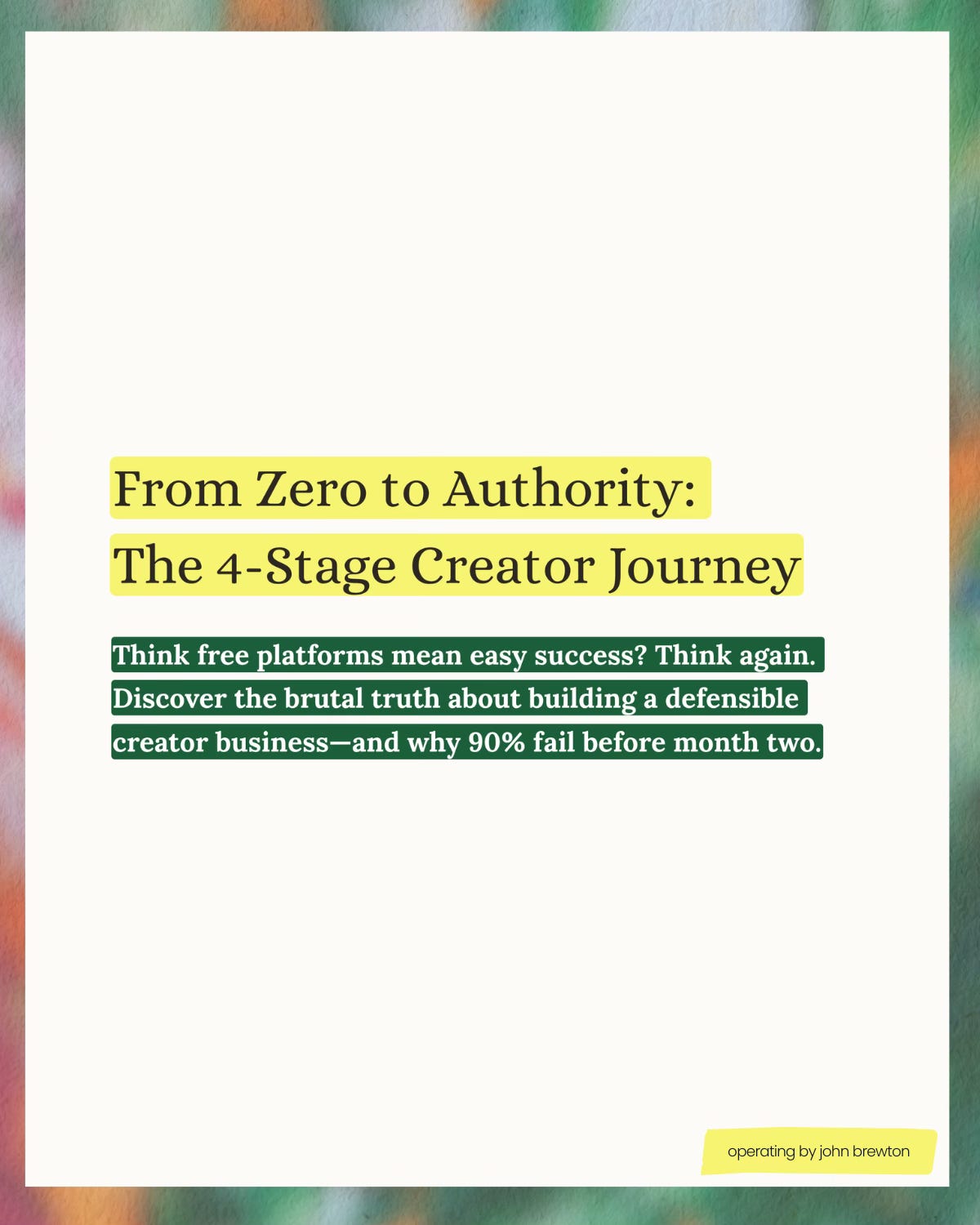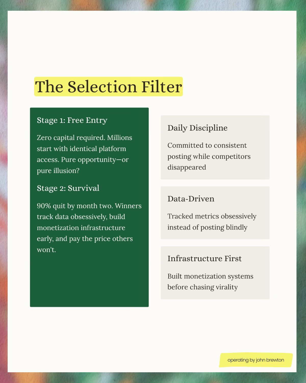 Low barrier to entry doesn’t mean low barrier to success. In fact, they’re inversely related. Because entry is easy, success requires extraordinary discipline in three dimensions: showing up (Stage 2), investing strategically (Stage 3), and compounding long enough to build defensibility (Stage 4).
