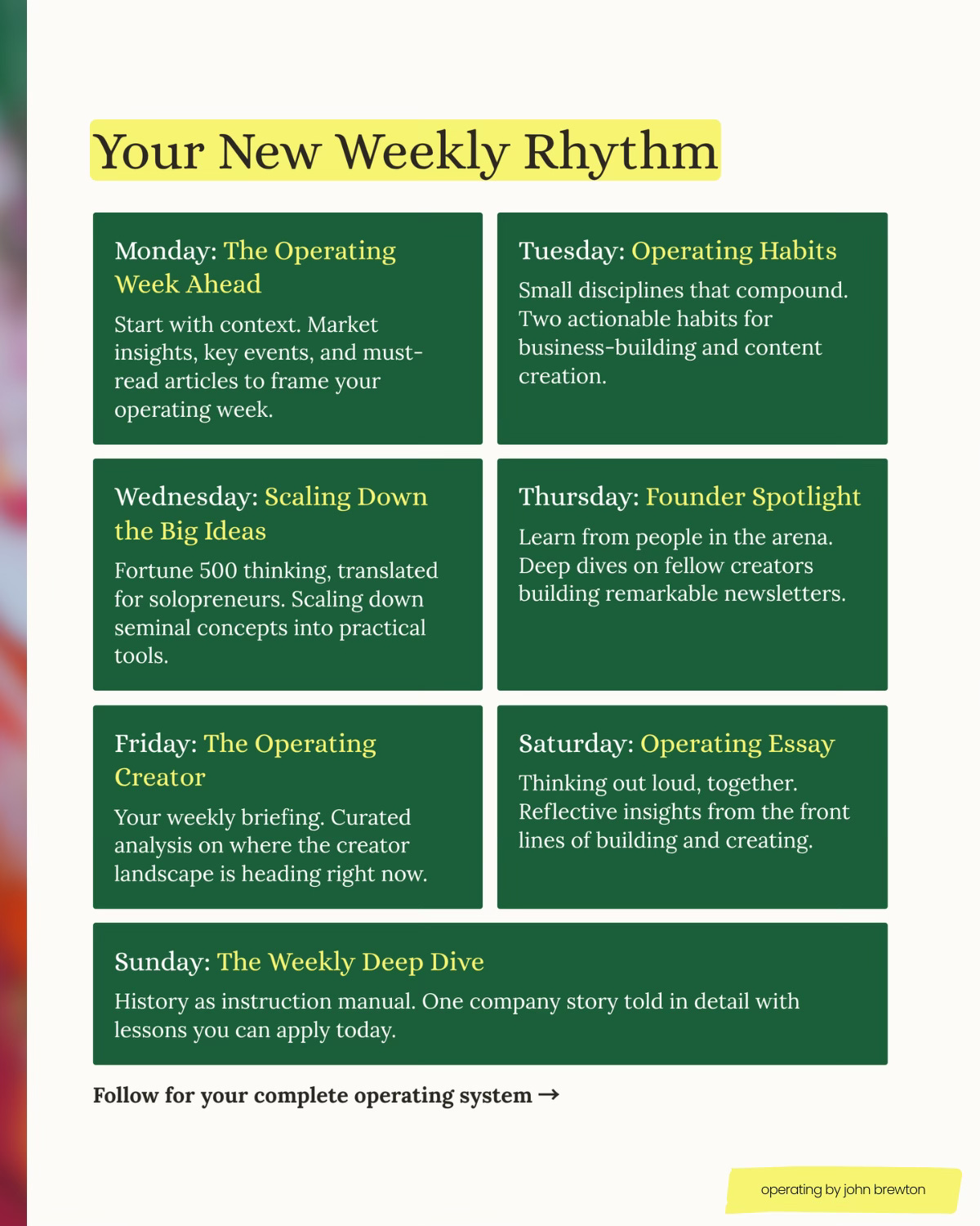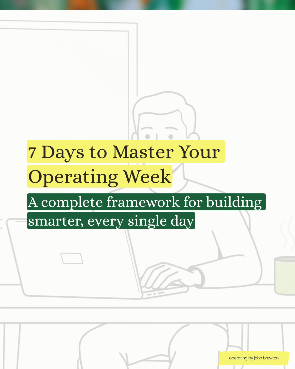 This isn’t a vague promise about “providing value.” Here’s exactly what Operating by John Brewton will deliver every week, for the next 52 weeks.