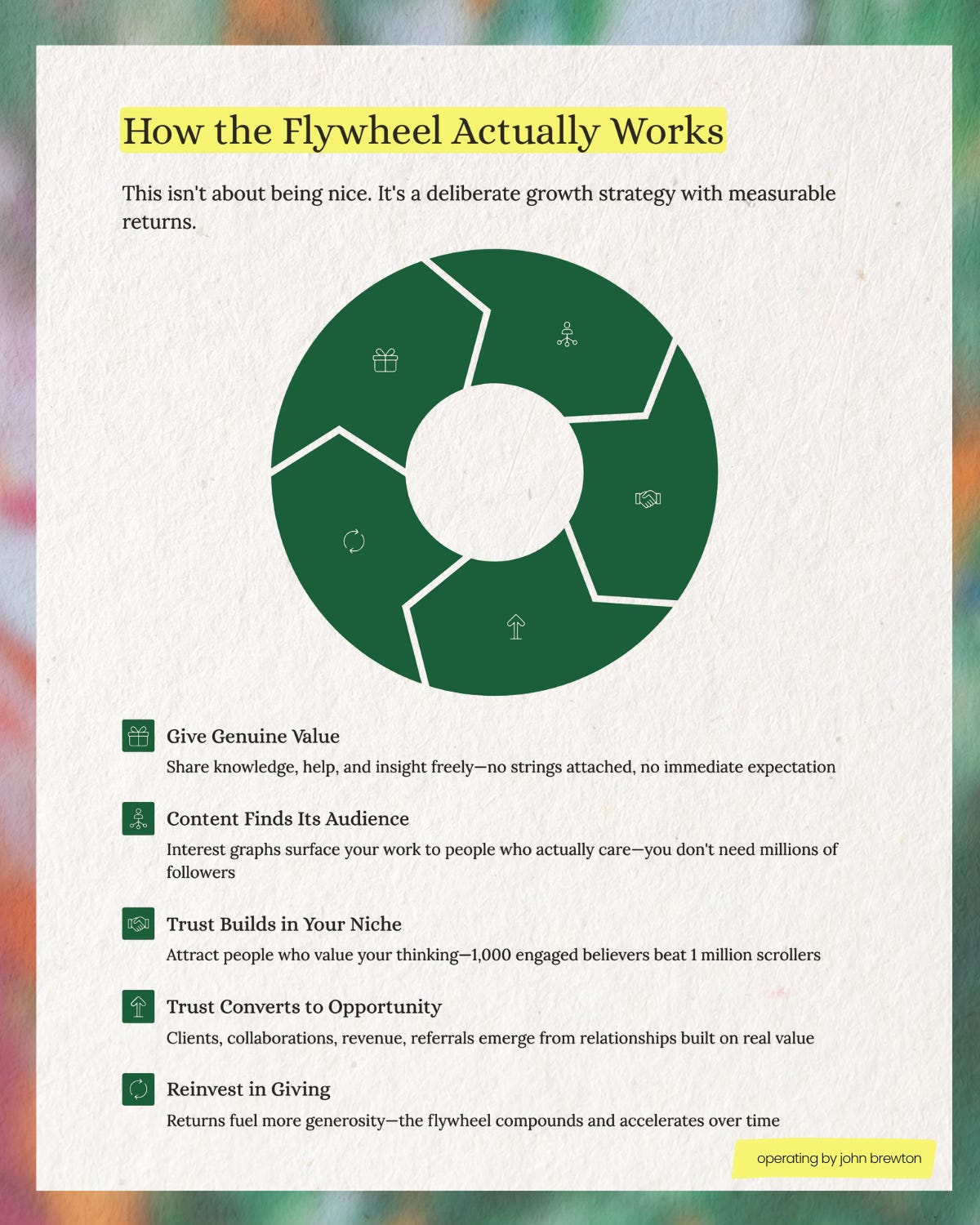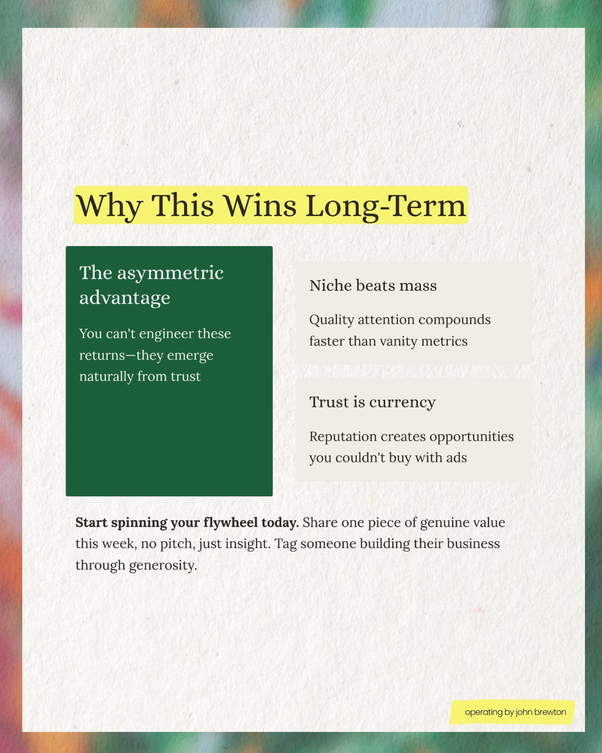 Trust is the moat AI can’t cross. AI can generate content. It can’t generate the relationship someone has with you after you’ve helped them. Trust earned through generosity over time is your actual competitive advantage.