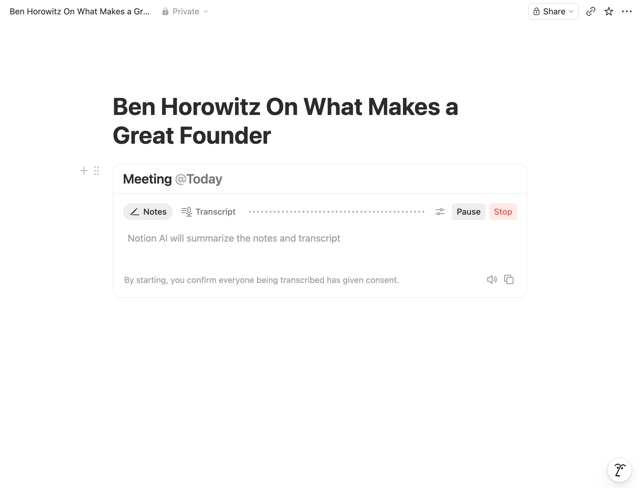 I open a new Notion page and configure it as a meeting file. Inside that file, I select the Meeting Transcription option. This is the move most people don’t know about. Notion’s transcription feature isn’t just for Zoom calls. It captures system audio — meaning anything playing through your computer gets transcribed, not just your microphone. That’s the mechanic that makes this whole system work.