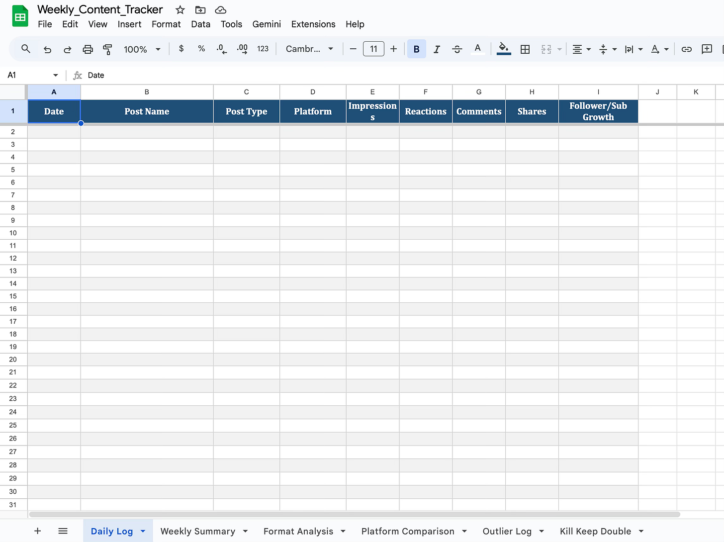 Continue the Week 1 routine. Log each post from the previous day into the Daily Log tab: date, post name, post type, platform, impressions, reactions, comments, shares, follower/subscriber growth.