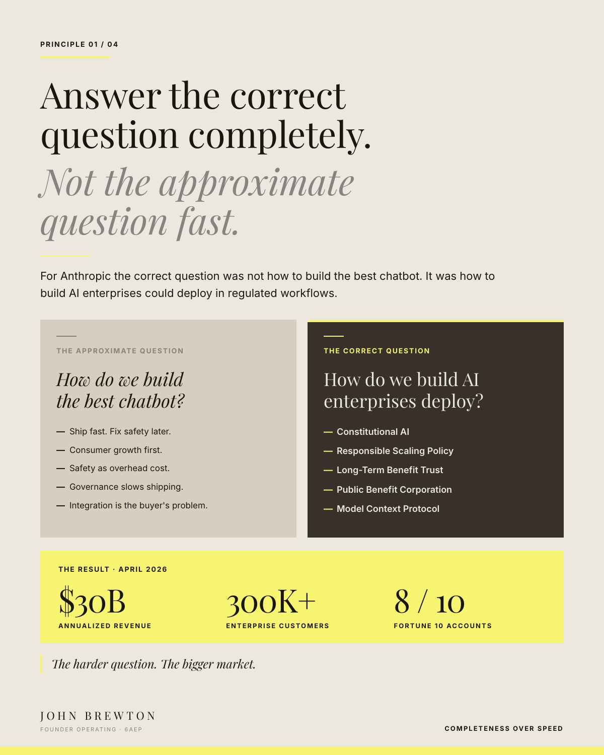 Answer the correct question completely, not the approximate question fast. The operating discipline is to identify the correct question before anyone else does. For Anthropic, the correct question was not how to build the best chatbot. The correct question was how to build AI that enterprises can actually deploy in regulated workflows. Constitutional AI, the Responsible Scaling Policy, the Public Benefit Corporation structure, the Long-Term Benefit Trust, and the MCP protocol are all different angles on the same correct answer. Each took longer than the equivalent ChatGPT feature would have taken. Each produces more durable value.