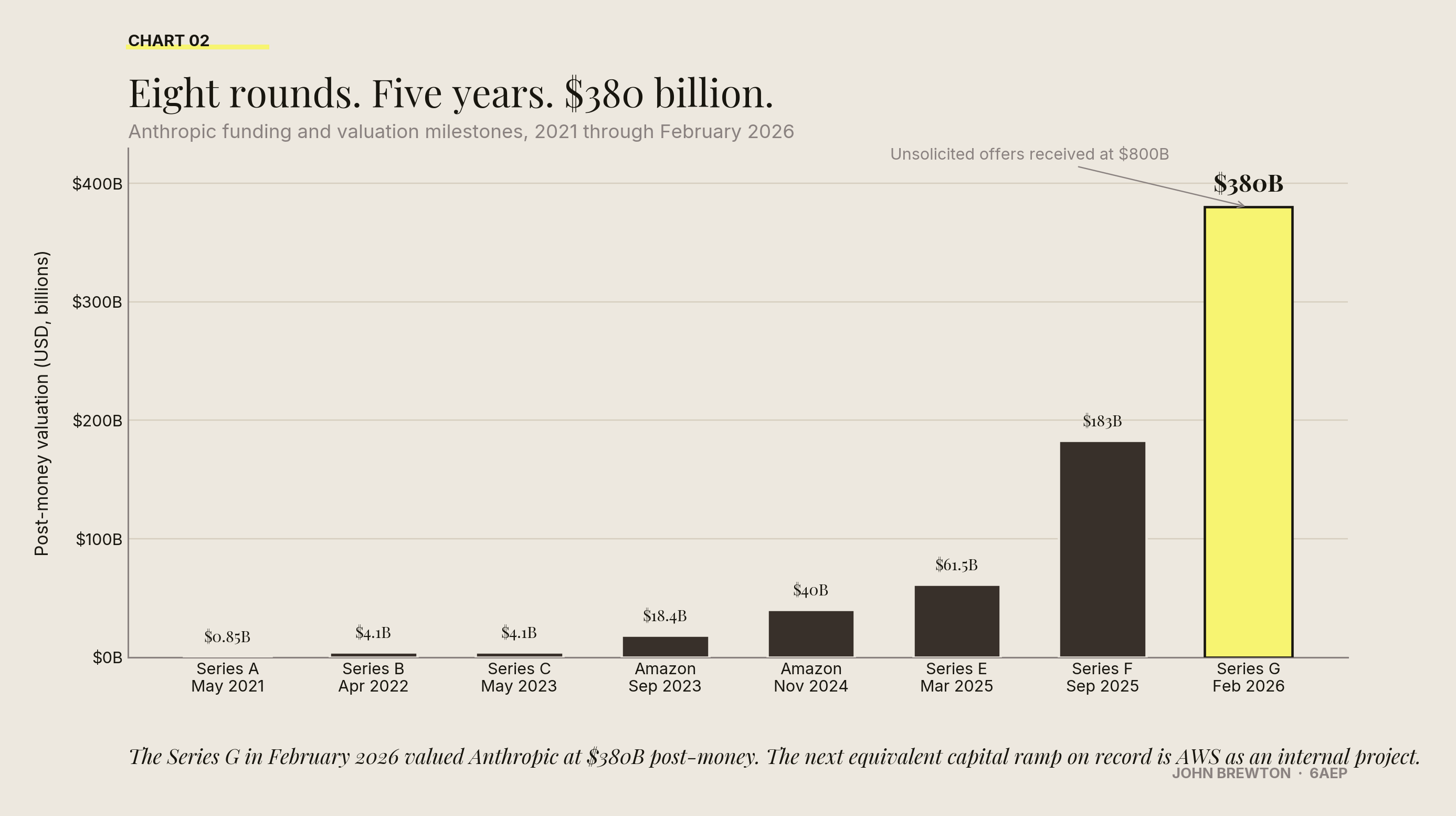 Anthropic now generates $30 billion in annualized revenue. It carries a $380 billion valuation and has received unsolicited offers at $800 billion. It has raised $65 billion across eleven funding rounds in five years. Eight of the ten Fortune 10 companies are customers. More than 500 businesses spend over $1 million per year on Claude. Claude Code went from zero to $2.5 billion in annualized billings in nine months.