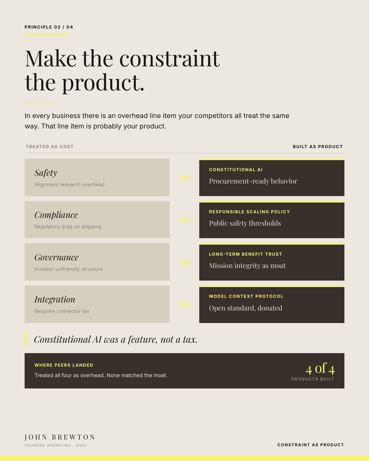 Make the constraint the product. In every business there is a constraint competitors treat as a cost that you can treat as the product. For Anthropic, safety was that constraint. The received wisdom in AI in 2021 was that safety was an overhead, a drag on capability that you had to accept because regulators would eventually demand it. Anthropic inverted the assumption. Safety became the thing enterprises were buying. Constitutional AI was a feature, not a tax. The Responsible Scaling Policy was a selling point, not an apology. Find the overhead line item in your own business that your competitors all treat the same way. That line item is probably your product.