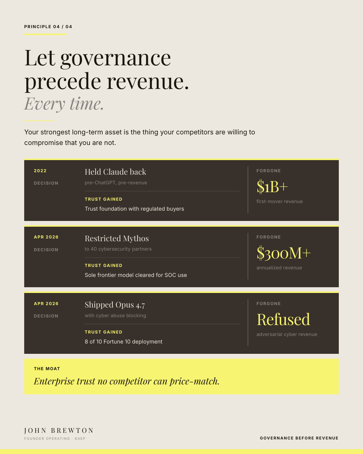 Let governance precede revenue, every time. Every time Anthropic has gained a new capability, it has made a governance decision before making a revenue decision. Claude 2022 was held back. Mythos 2026 was restricted to forty partners. Opus 4.7 shipped with automatic detection and blocking of high-risk cybersecurity requests. Each decision was made against a public, specific, and auditable written standard. Each decision forewent short-term revenue to reinforce a long-term trust position. Your strongest long-term asset is the thing your competitors are willing to compromise that you are not.