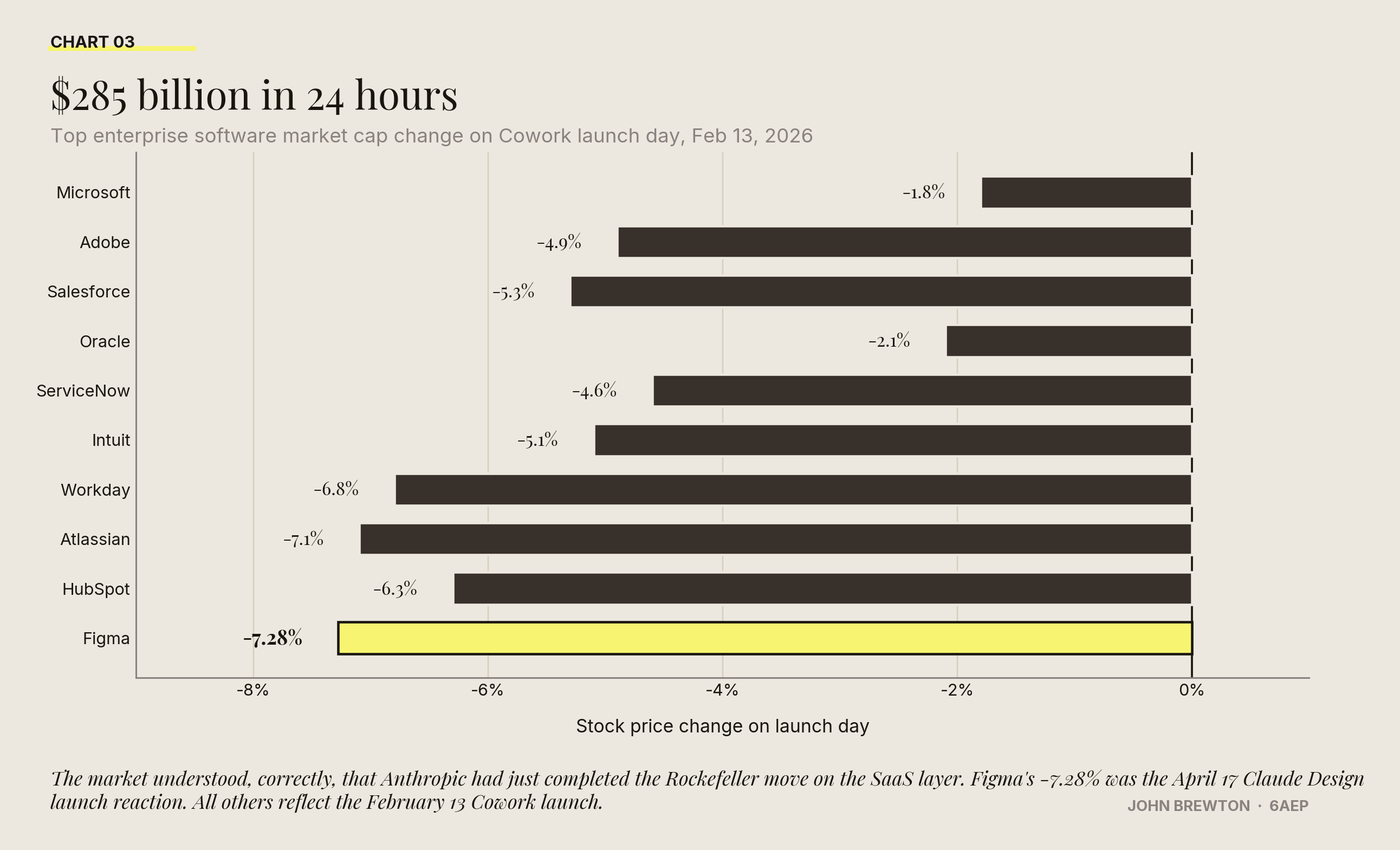 The Standard Oil pattern is why the Cowork release wiped $285 billion in market cap in 24 hours. The market understood, correctly, that Anthropic had just completed the Rockefeller move on the SaaS layer. Every enterprise software category charging per-seat for a specific UI on top of specific data had just been informed that the UI was optional and the data was accessible through a new control layer.