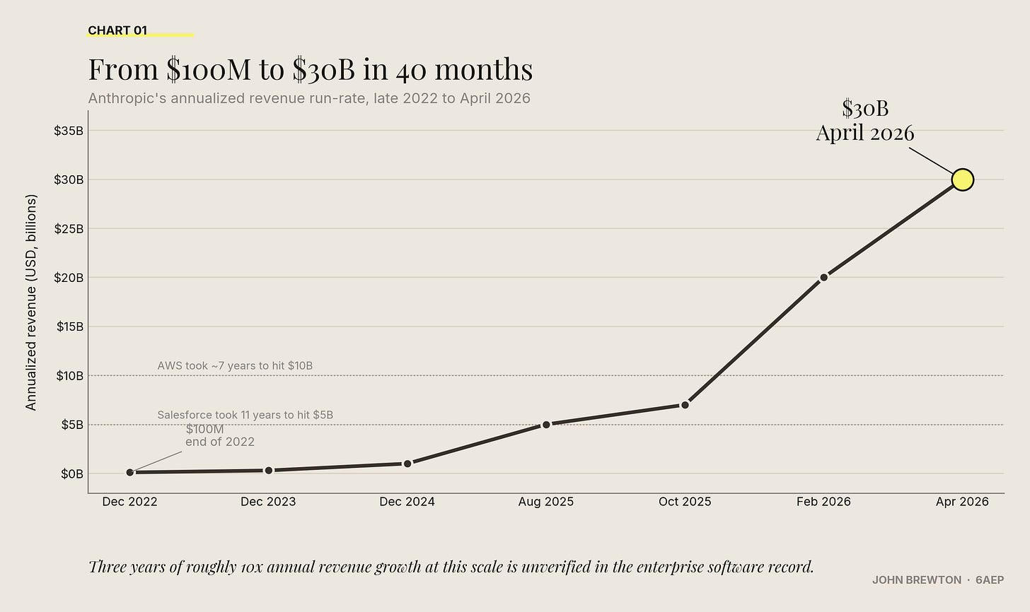 The revenue arc is what it is. $100 million annualized at the end of 2022. $1 billion by December 2024. $5 billion by August 2025. $7 billion by October 2025. $30 billion by April 2026. Three consecutive years of roughly 10x annual revenue growth at this scale is unverified in the enterprise technology record. Salesforce took eleven years to hit $5 billion in revenue. Amazon Web Services took about seven years to hit $10 billion. Anthropic hit $10 billion in roughly 24 months after crossing $1 billion.