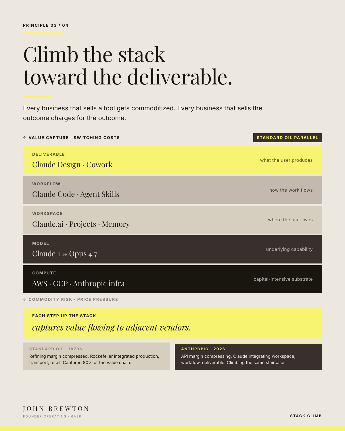 Climb the stack toward the deliverable. Every business that sells a tool gets commoditized. Every business that sells an outcome gets to charge for the value of the outcome. You start by selling the tool. You add a workspace that captures the user’s state. You add integrations that make the workspace the default. You climb down the stack to the deliverable the user was going to produce with your tool anyway. Each step up the stack increases switching costs. Each step down the stack captures value that was flowing to adjacent vendors. For Anthropic, the climb from Claude 1 (tool) to Cowork (outcome) is the most compressed version of that pattern on record.