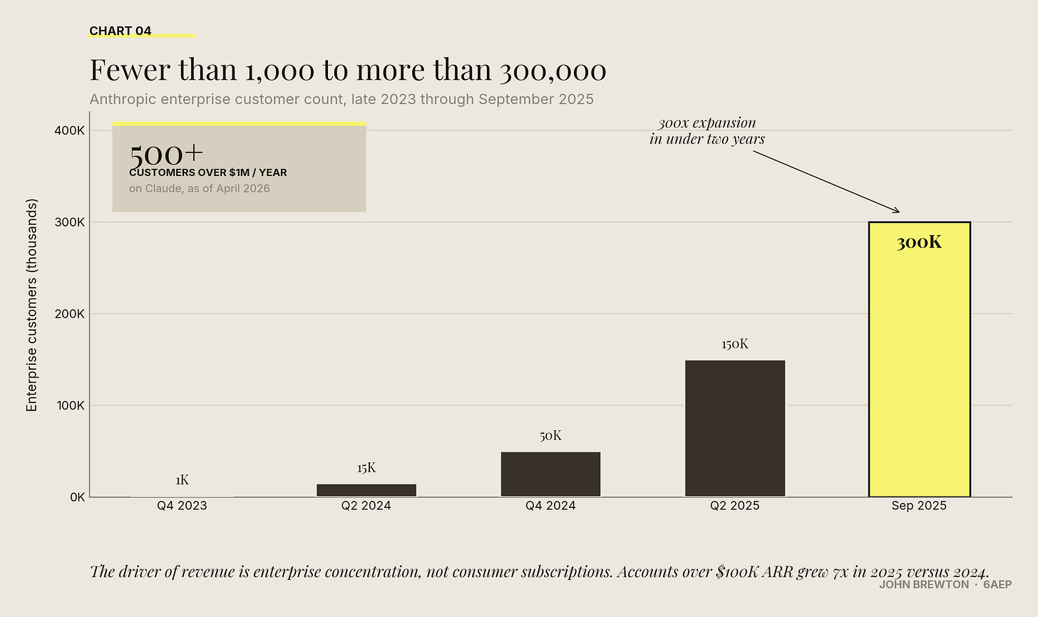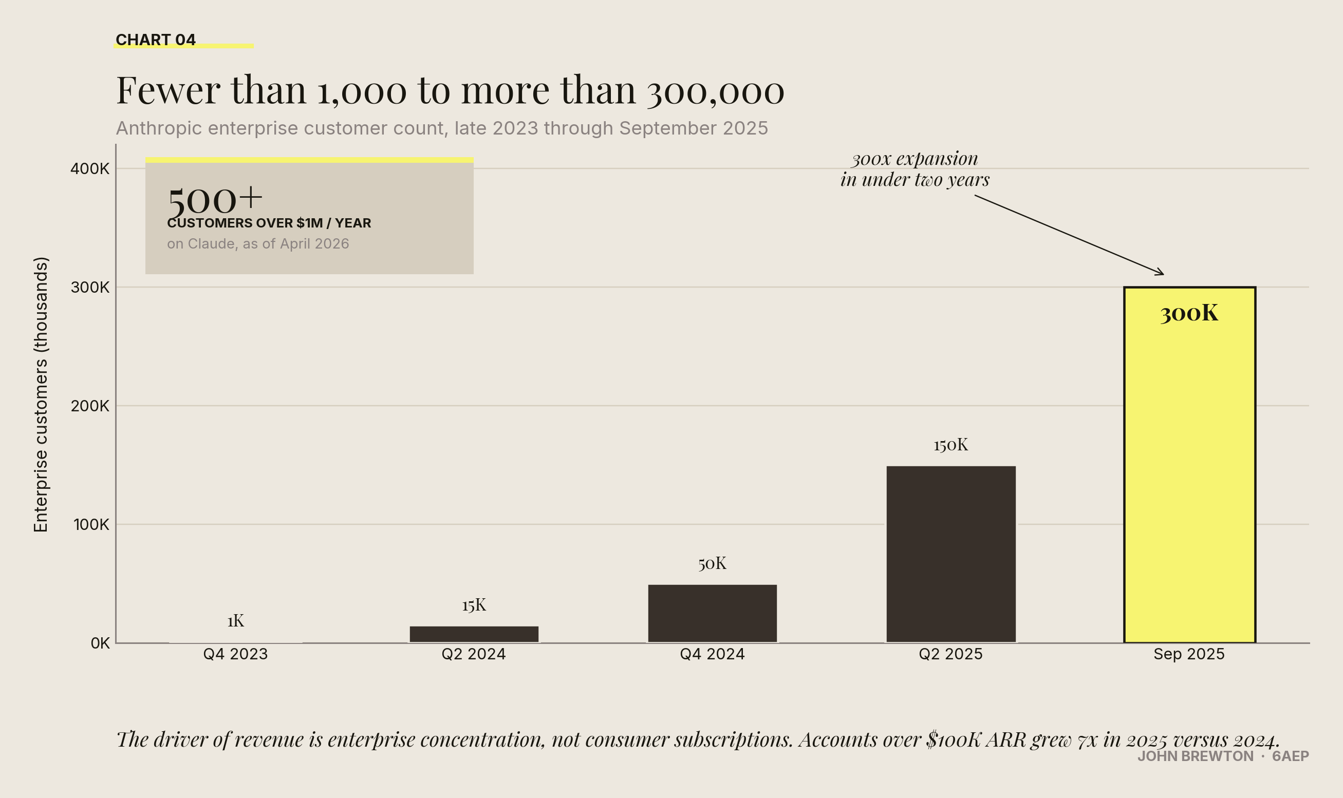 The driver is enterprise concentration, not consumer subscriptions. Accounts generating more than $100,000 in annual recurring revenue grew 7x in 2025 over 2024. The total enterprise customer base grew from fewer than 1,000 in late 2023 to more than 300,000 in September 2025. That is a 300x expansion in under two years.