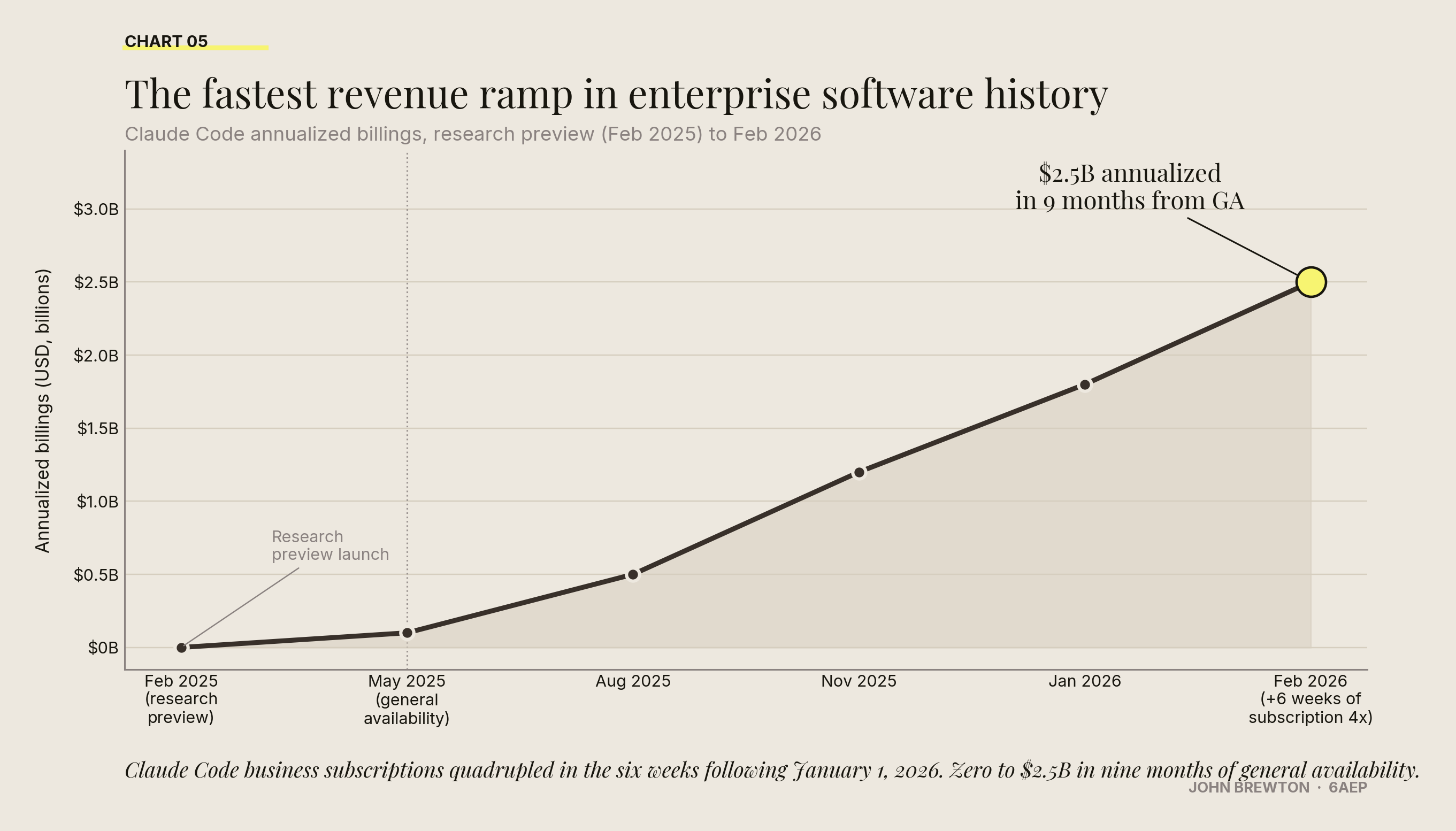 Claude Code is the inside story. It launched as a research preview in February 2025 and hit general availability in May 2025. It went from zero to over $2.5 billion in annualized billings in roughly nine months. Business subscriptions on Claude Code quadrupled in the six weeks following January 1, 2026. That is the fastest revenue ramp of any product in enterprise software history.
