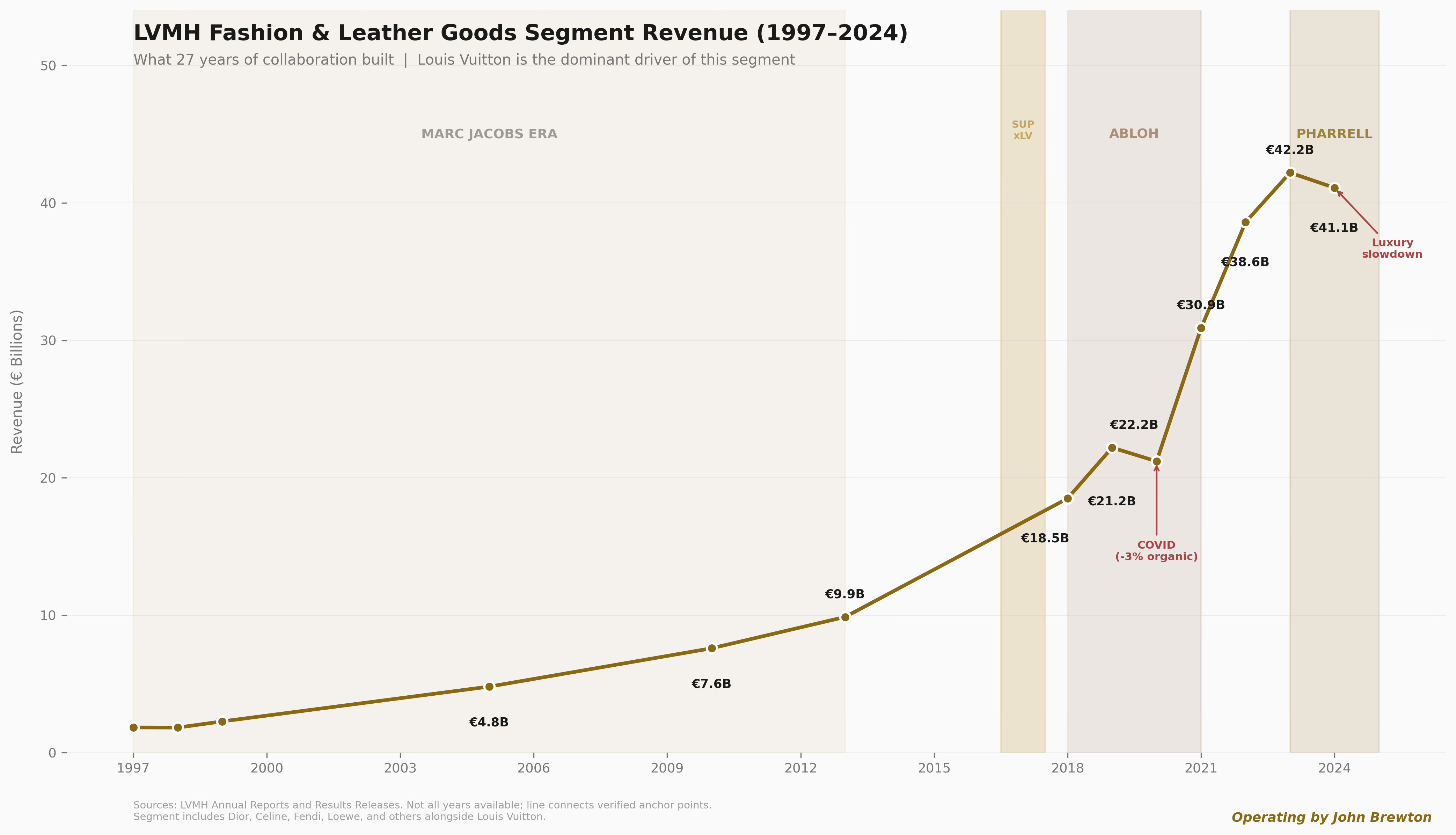 The scale of what Jacobs built is visible in the segment data. When he arrived in 1997, LVMH’s Fashion & Leather Goods segment generated €1.84 billion in revenue. By the time he departed in 2013, that same segment had reached €9.88 billion — a 5.4x increase over sixteen years. Louis Vuitton was the dominant driver of that growth.