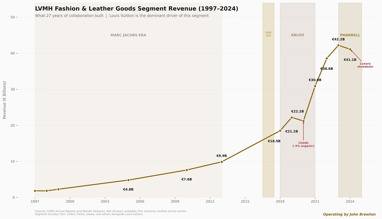 Louis Vuitton turns collaboration into a scalable operating system for relevance. It absorbs culture by choosing the right creative partners, running them through hard brand codes, and using the resulting energy to drive a core business that has not fundamentally changed in decades. The LVMH Fashion & Leather Goods segment grew from €1.84 billion in 1997 to over €42 billion in 2023 — a more than twenty-fold increase built on a foundation of monogram canvas, Damier check, and an ever-widening circle of creative interpreters.