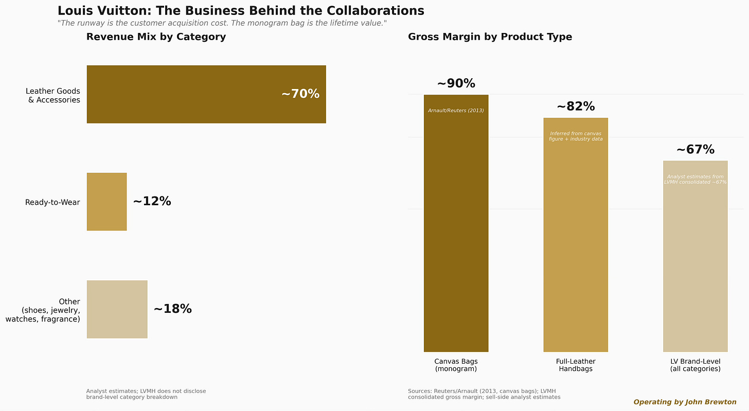 But here’s the part most people misunderstand: the clothes are not the business. The runway shows, the celebrity creative directors, the fashion-week spectacles, these are not the profit center either. They are the attention infrastructure. The actual business is leather goods and accessories. Analyst models allocate roughly two-thirds to three-quarters of LV’s revenue to bags, wallets, trunks, and small leather goods. According to a Reuters report referencing LVMH Chairman Bernard Arnault, classic monogram canvas bags generate gross margins of approximately 90%. Ready-to-wear represents only about 10–15% of sales.