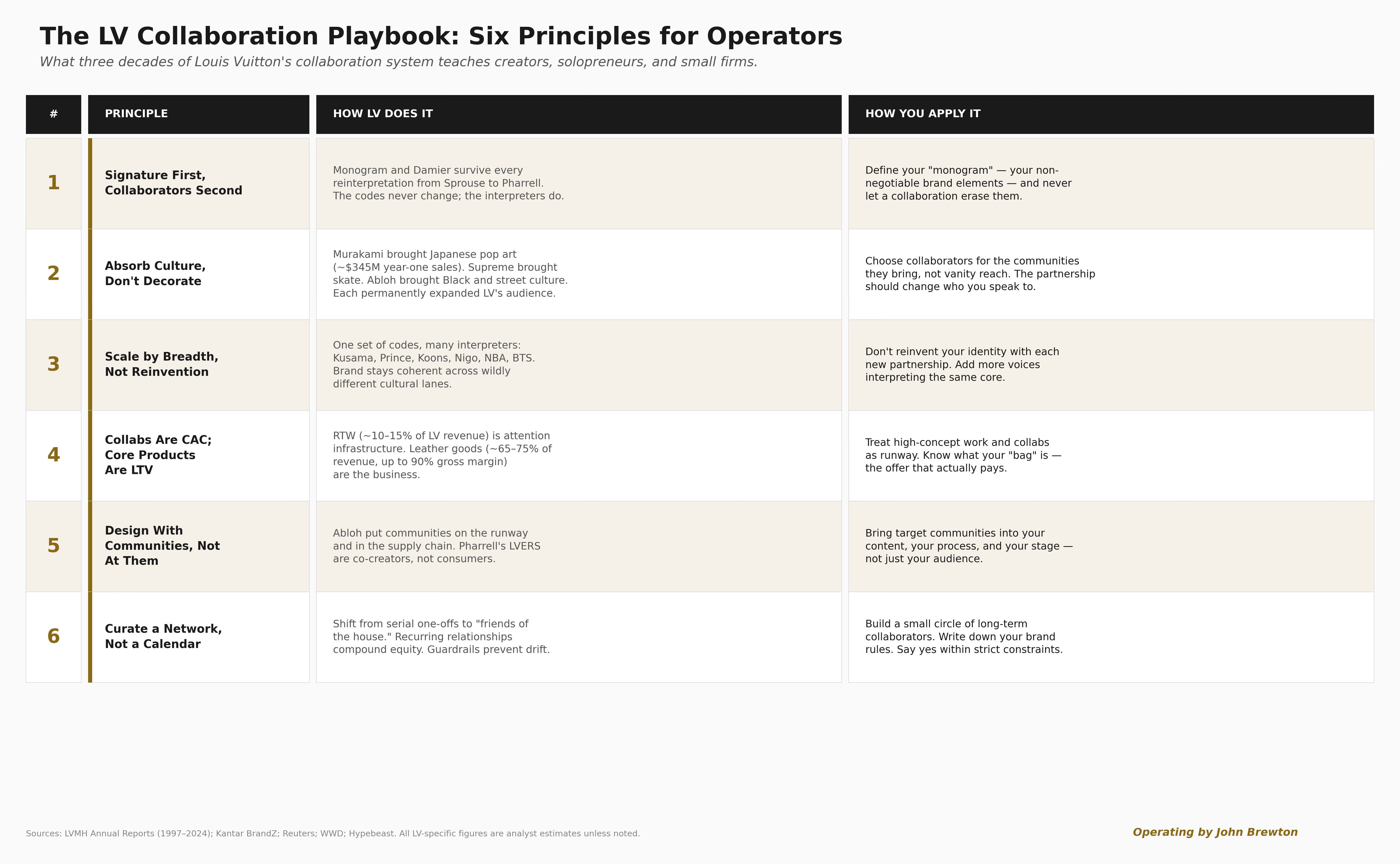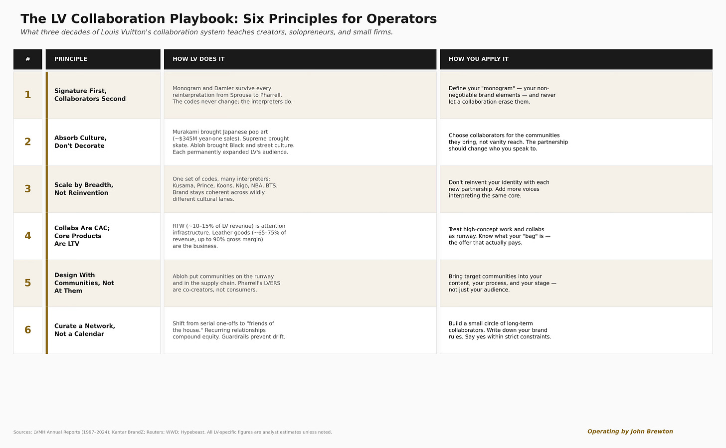The six operating principles that emerge from three decades of Louis Vuitton’s collaboration system, translated for creators, solopreneurs, and small firms