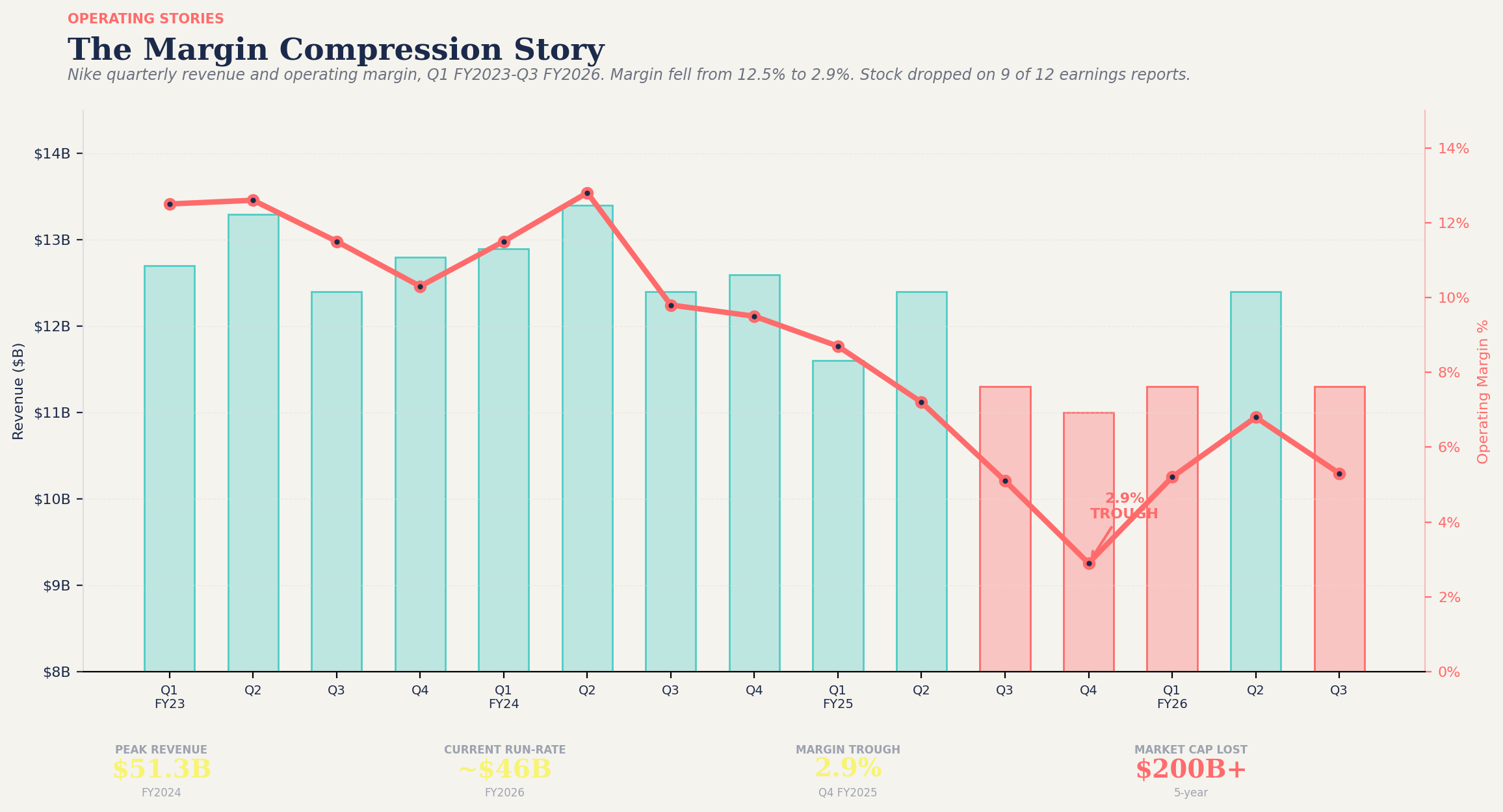 Revenue fell from $51.3 billion to a $46 billion run-rate. The stock dropped 56% over five years. More than $200 billion in market capitalization erased.