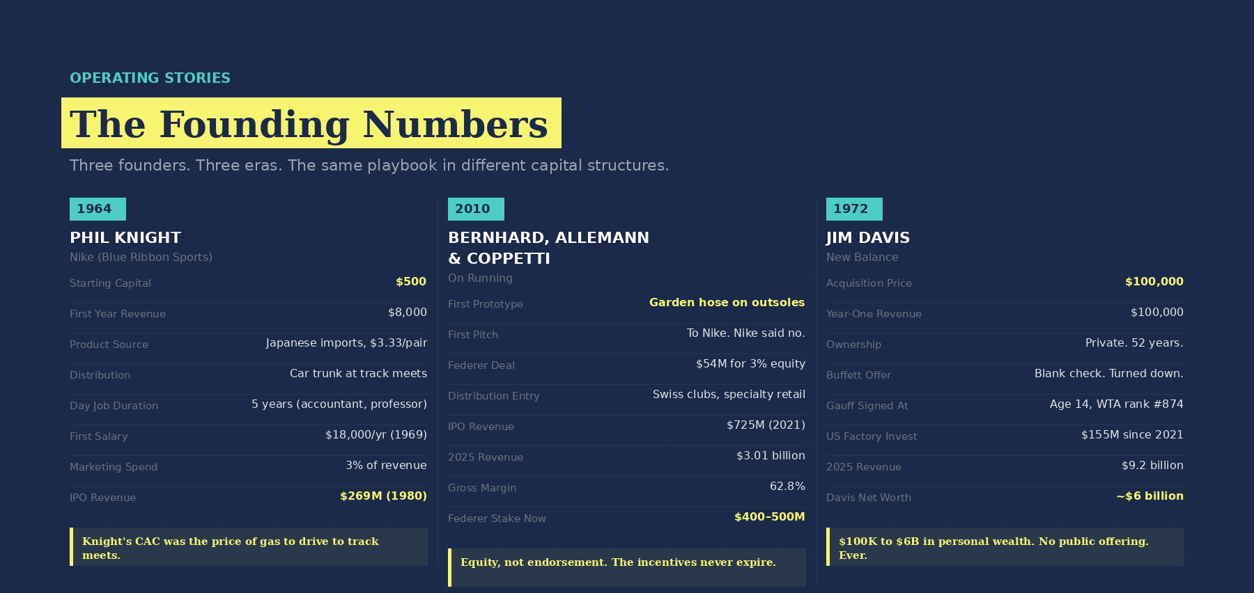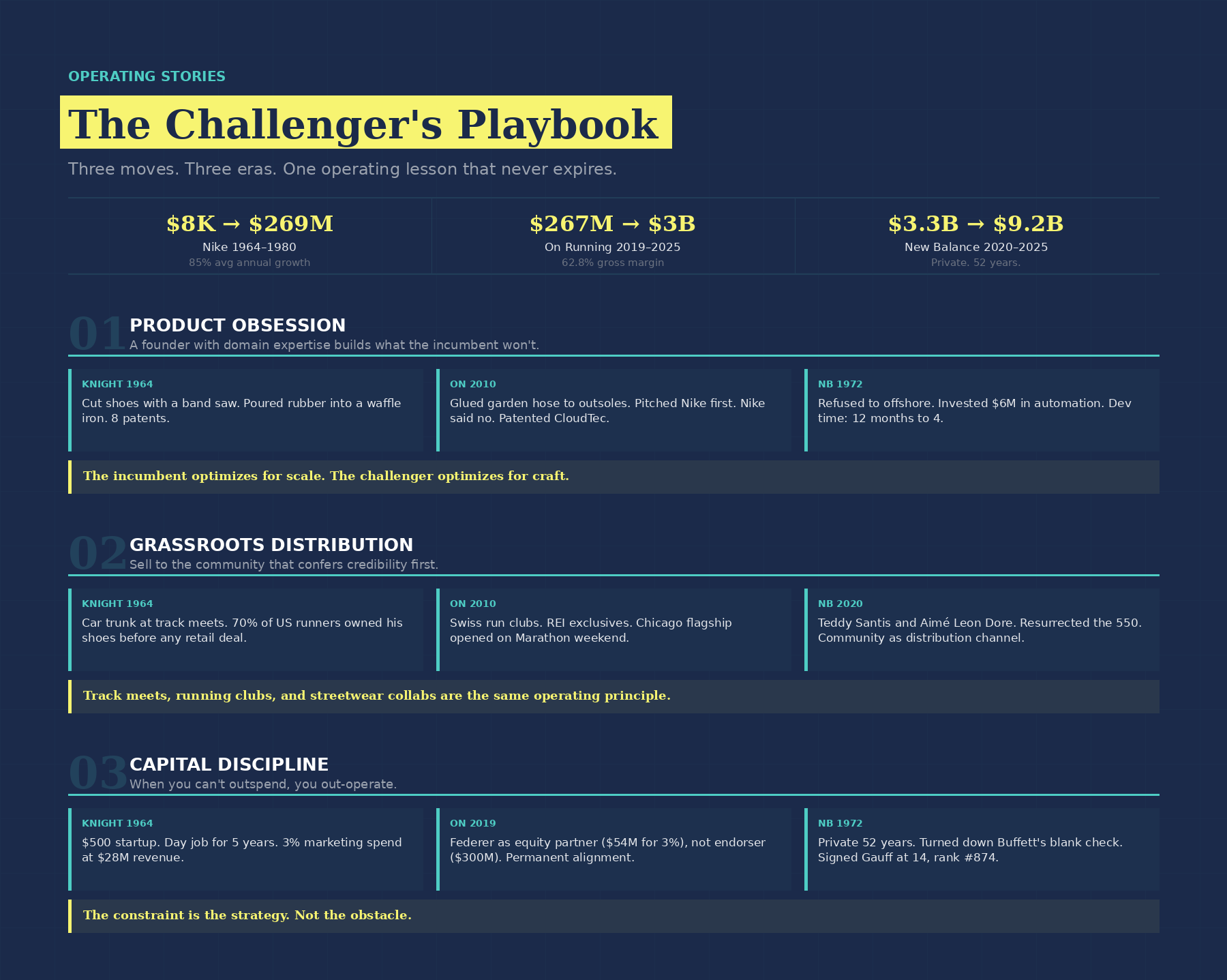 3. Capital constraints are a competitive weapon, not a disadvantage. Knight spent 3%. On gave Federer equity instead of a $300 million endorsement deal. New Balance stayed private for 52 years. Every constraint forced a better decision.