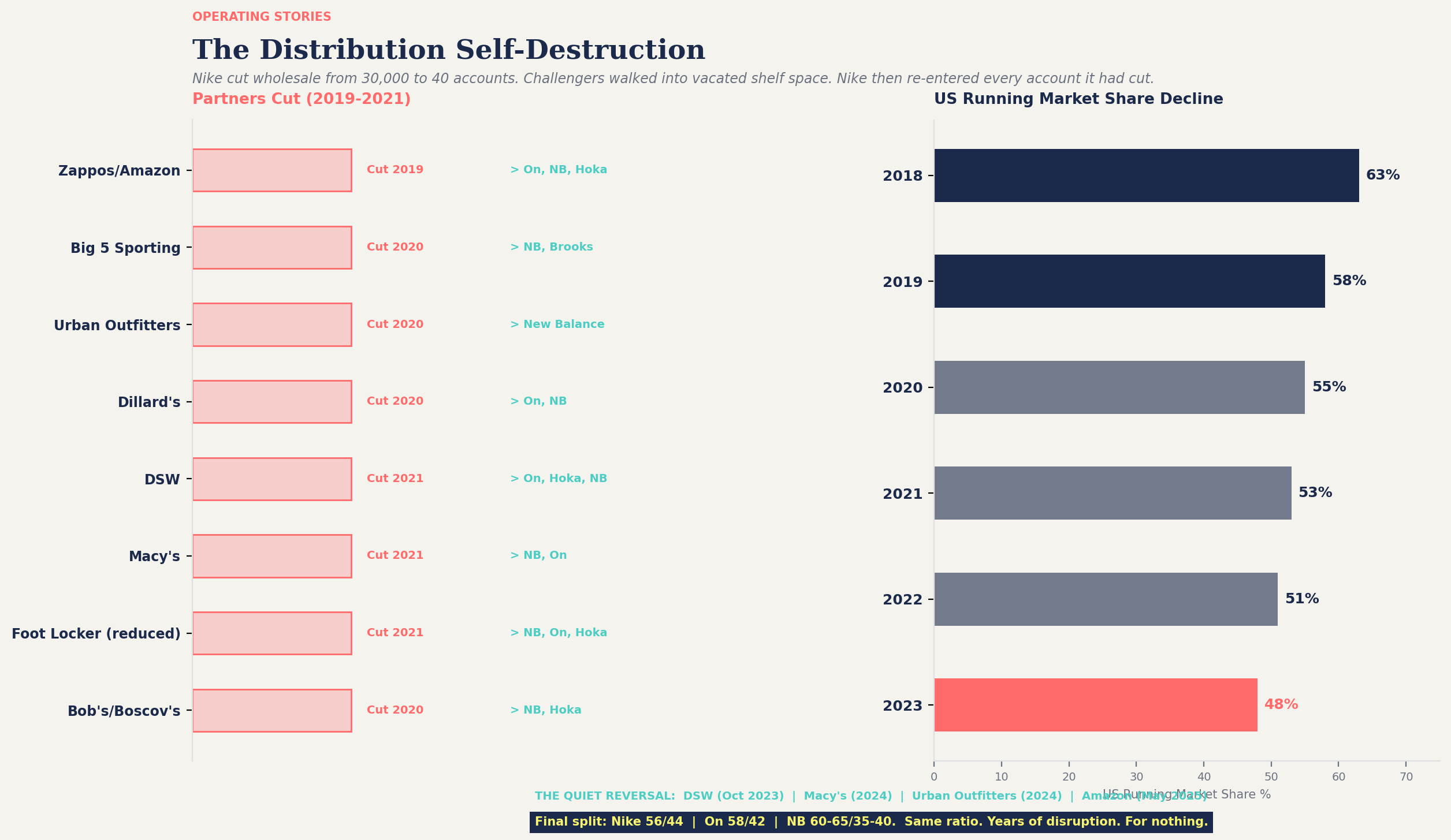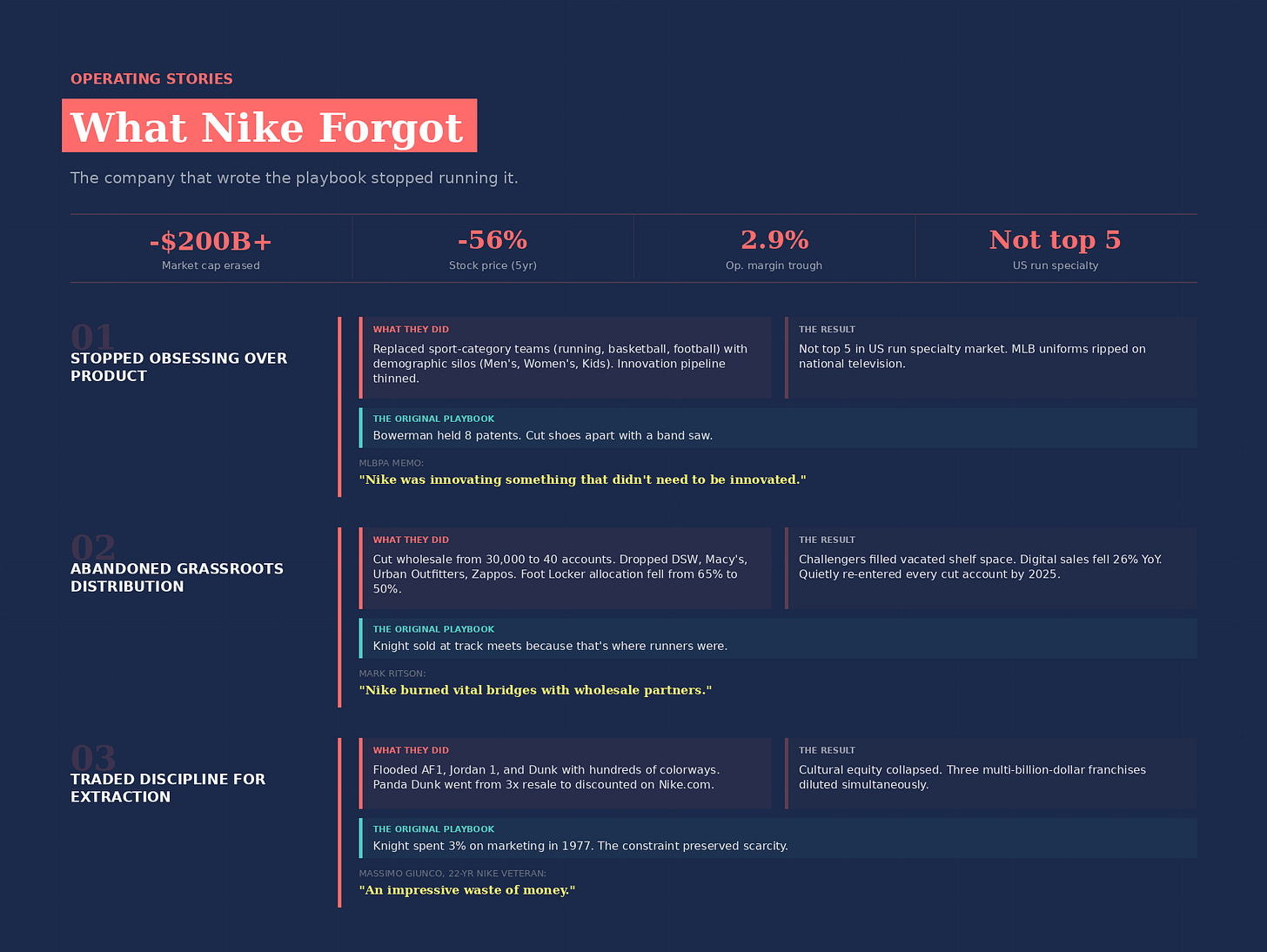 It abandoned grassroots distribution. Nike cut its wholesale partners from 30,000 to 40. It dropped DSW, Macy’s, Urban Outfitters, Zappos, and dozens more. Challengers walked into the vacated shelf space.