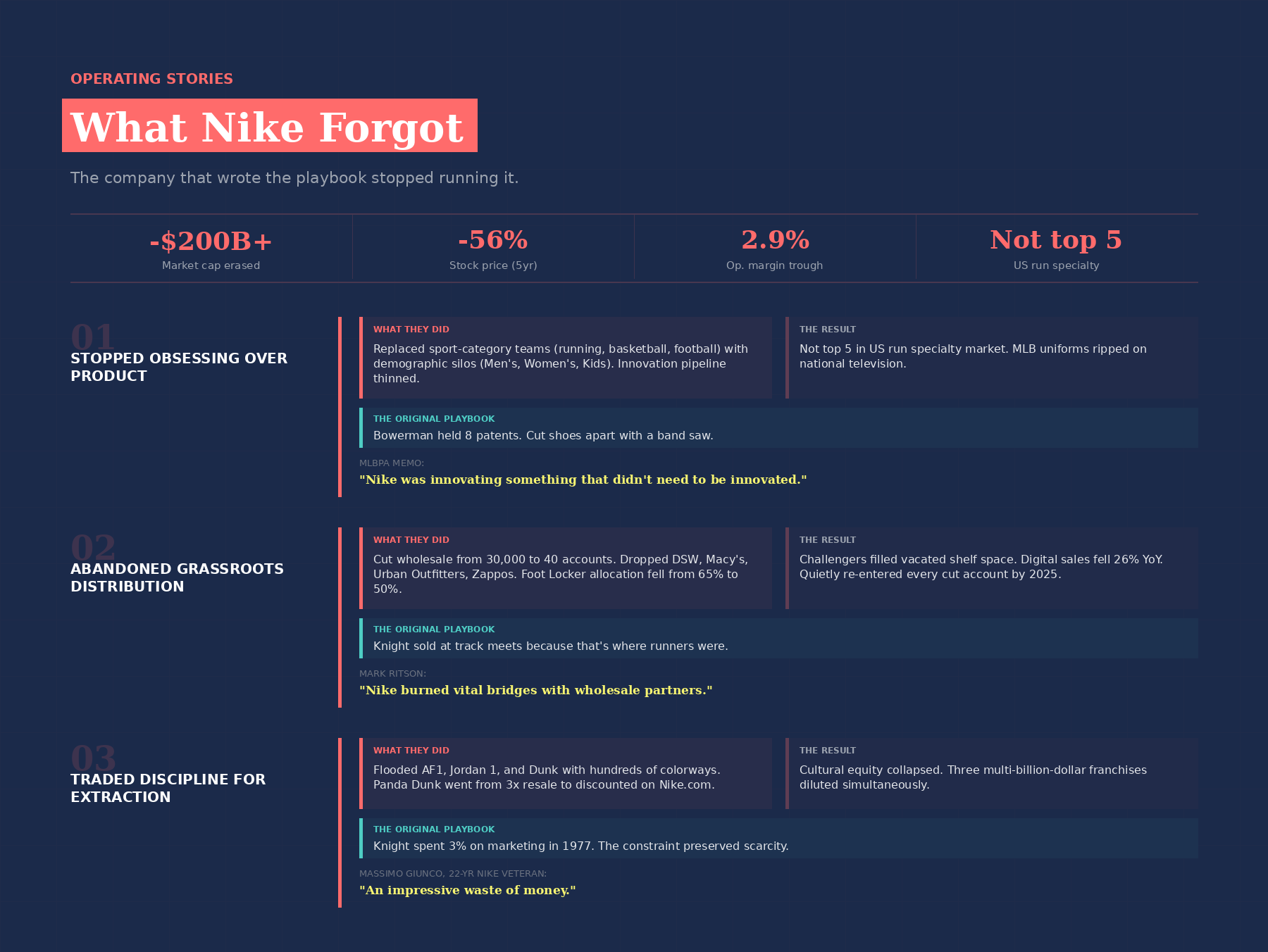 Both challengers grew because Nike opened the door. Between 2017 and 2025, Nike made three strategic mistakes that map precisely to the three moves of its own founding playbook.