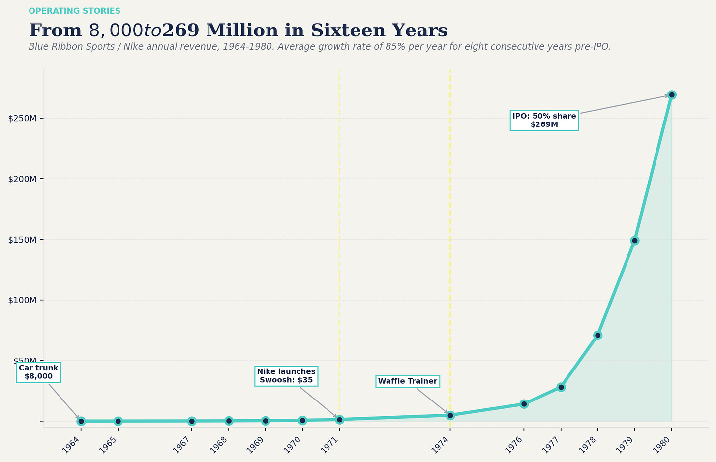 In 1964, Phil Knight sold 1,300 pairs of Japanese running shoes out of a Plymouth Valiant and grossed $8,000. His total startup capital was $500. He kept his day job for five years. By 1980, Nike commanded 50% of the US athletic shoe market with $269 million in revenue. Sixteen years to acquire and 50% of the market. That’s the first operating lesson.