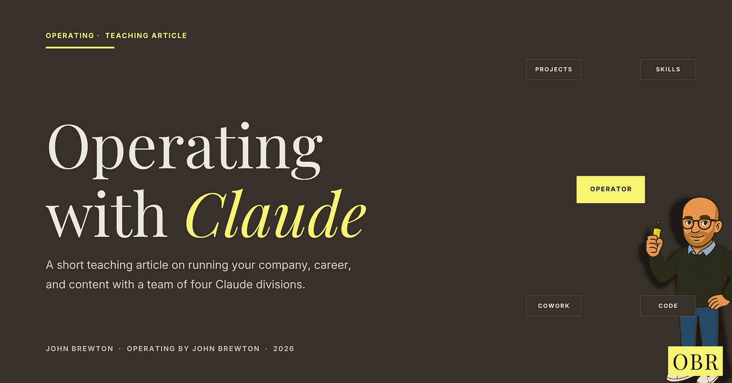 I have a Project called Operating Stories. That division conducts my weekly research for my Operating Stories, drafts the article for me to edit and generates all of the associated digital assets and visuals. It knows my voice rules, my banned word list, my engagement data, and has access to every article in the series that I’ve published, as well as performance data.