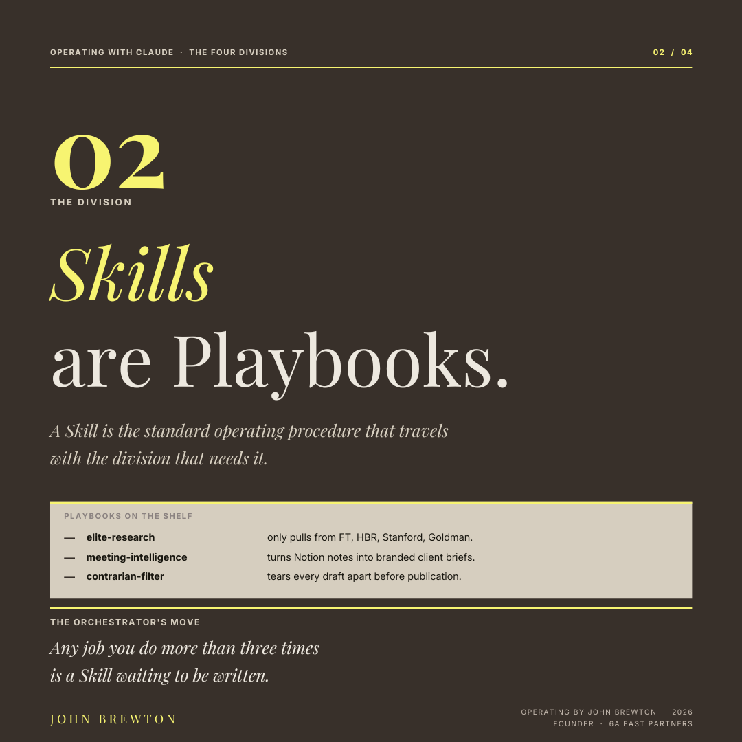 The orchestrator’s move: Any job you do more than three times is a Skill waiting to be written.