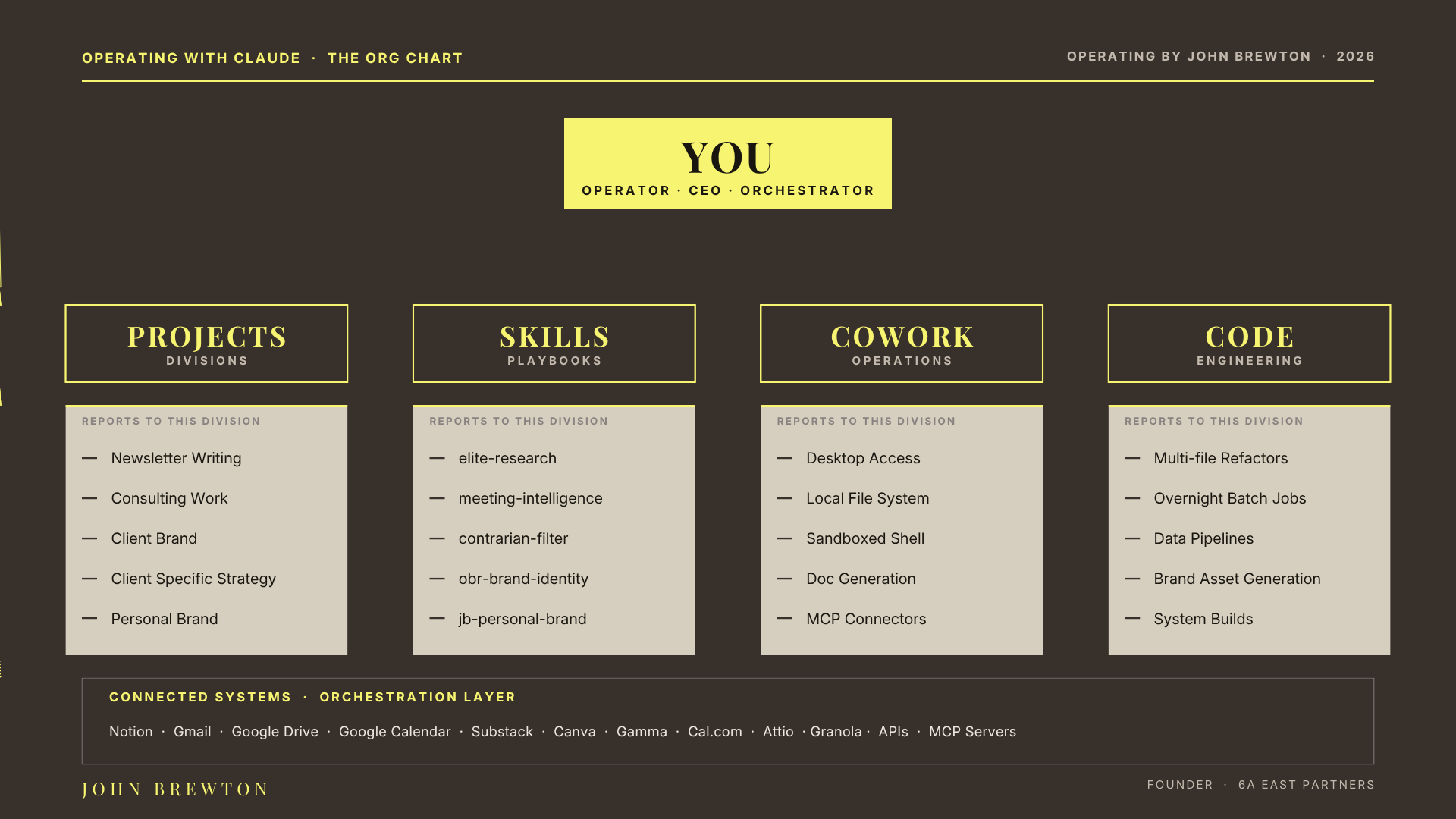 Orchestration is not only about the four divisions. It is about the wires that connect them to the software you already use. Notion. Gmail. Google Drive. Substack. Your CRM. Claude plugs into all of it through APIs and MCP servers. Every connection you add raises the ceiling on what the company can take on.