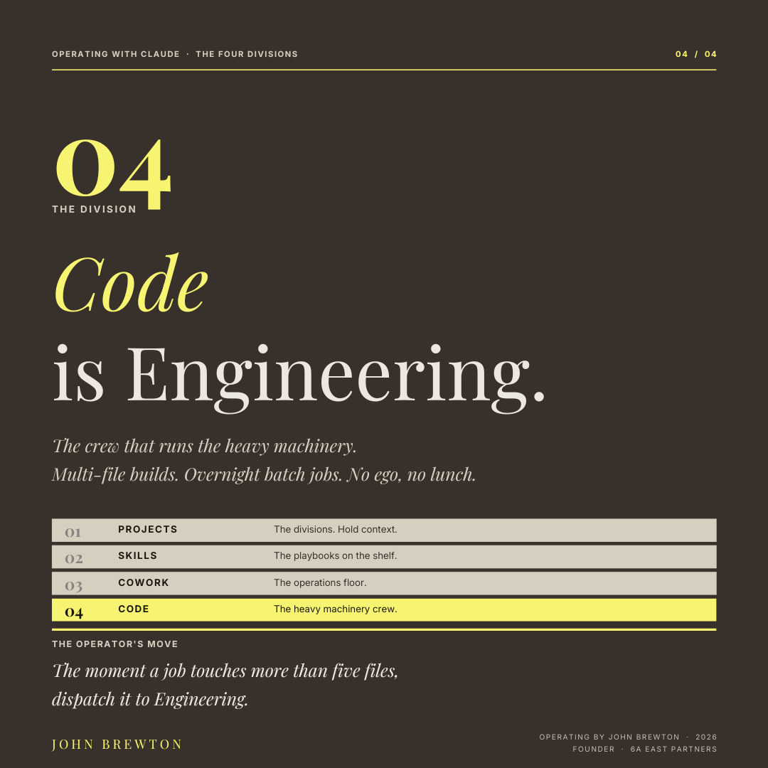 If Cowork is the shop floor, Code is the crew that runs the heavy machinery. Big refactors. Multi-file builds. Overnight batch jobs. You leave the work. You come back in the morning. The job is done.