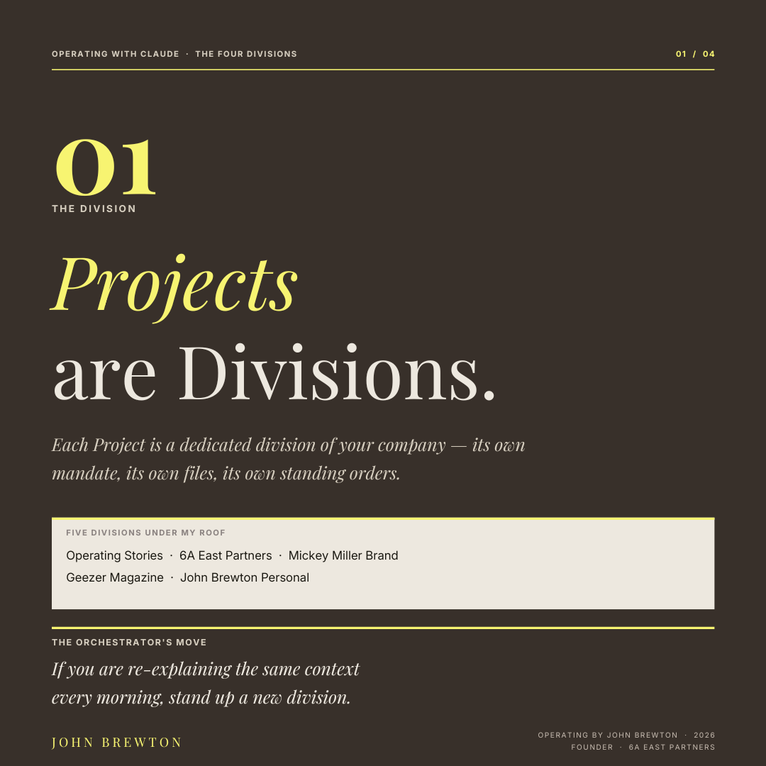 A Project is a division of your company. Each division has its own mandate, its own files, its own institutional memory, and its own standing orders.