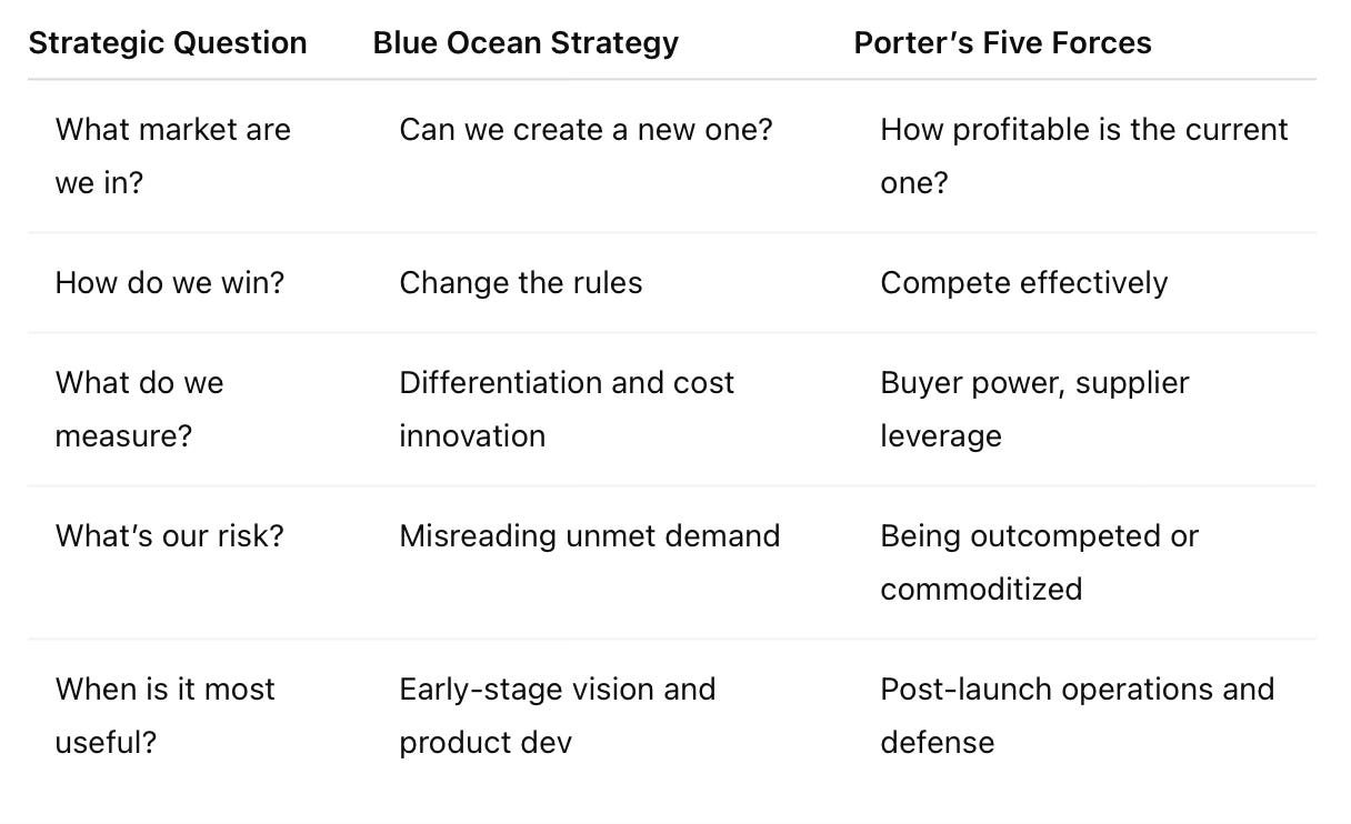 Blue Ocean Strategy helps you think. Porter’s Five Forces helps you operate. One is about shaping markets. The other is about surviving them.