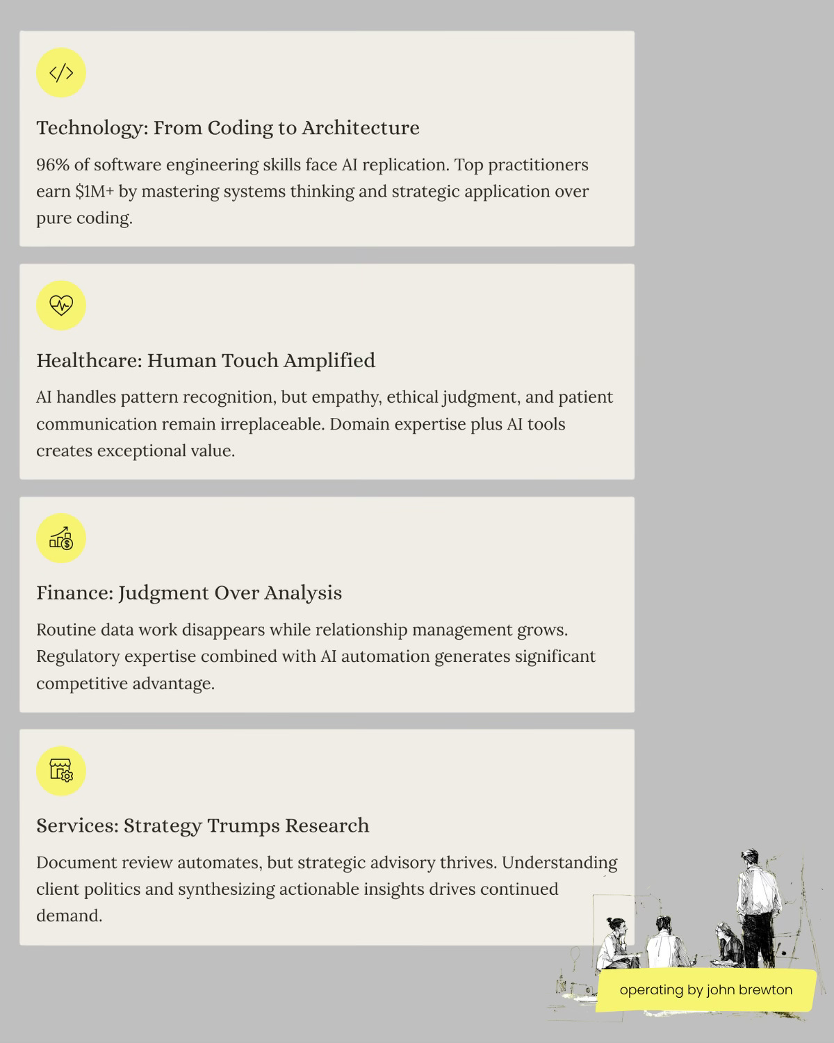 What’s most counterintuitive about this transformation is which capabilities matter. Technical competencies that commanded premium wages for decades are being commoditized as AI replicates capabilities once requiring years to master. Meanwhile, human capabilities, emotional intelligence, judgment, creativity, leadership, now create decisive value.