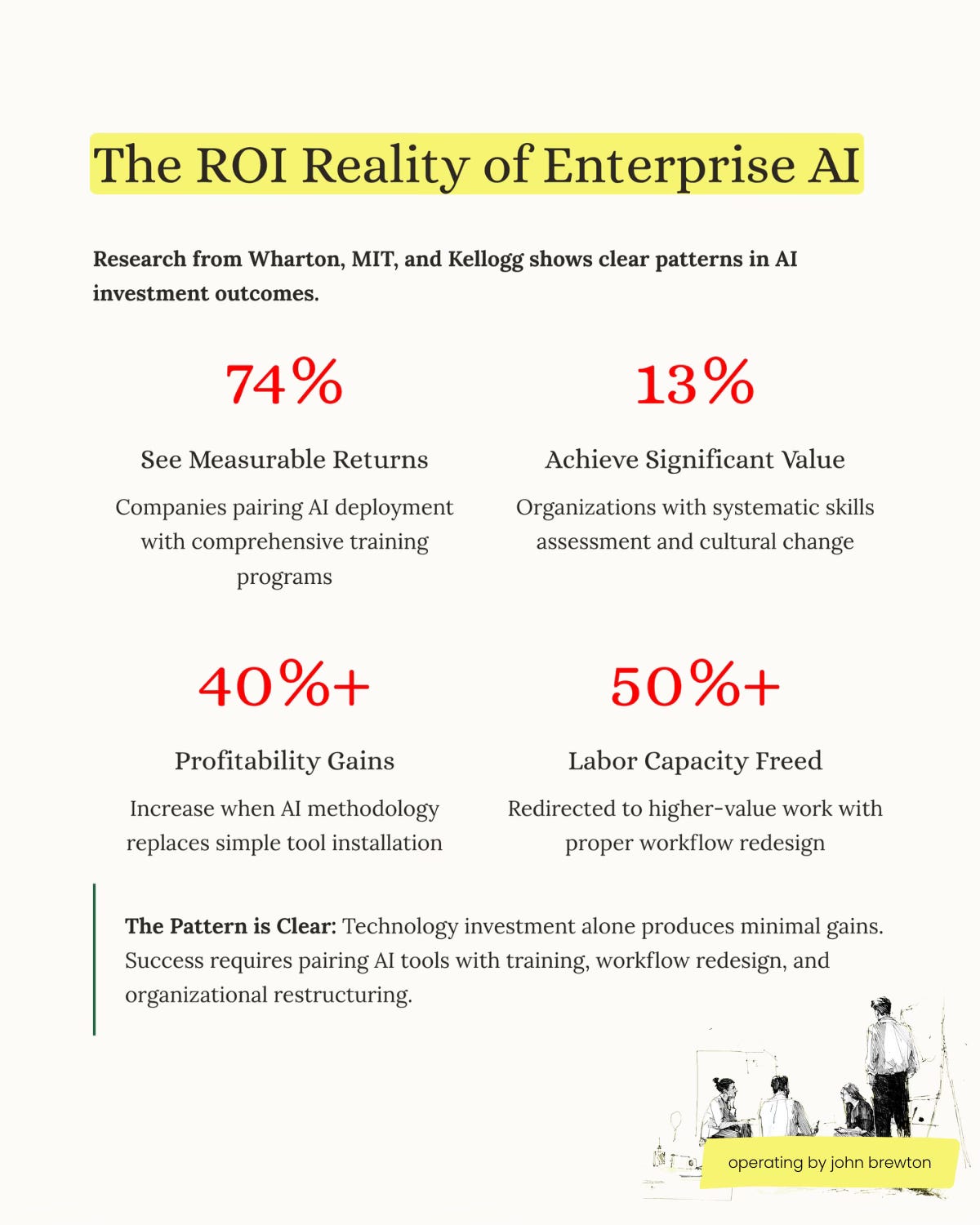 Research from Wharton, MIT, and Kellogg reveals the pattern: 74% of companies using generative AI see measurable returns when they pair technology deployment with comprehensive training. The 13% achieving significant value share common characteristics; systematic skills assessment, investment in workforce development accompanying technology purchases, cultural change enabling experimentation, and measurement frameworks linking AI adoption to business outcomes.
