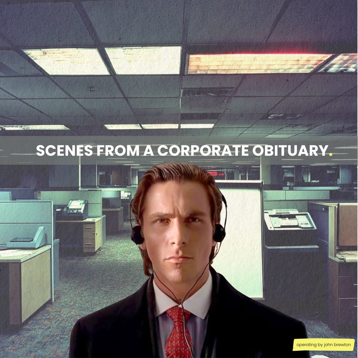 Scenes From a Corporate Obituary A short story about the slow, bureaucratic death of corporate life — told through meetings that multiply like bacteria, performance reviews that insult your intelligence, and a calendar that looks like a Mondrian painting if Mondrian hated you. Funny, dark, and uncomfortably familiar.