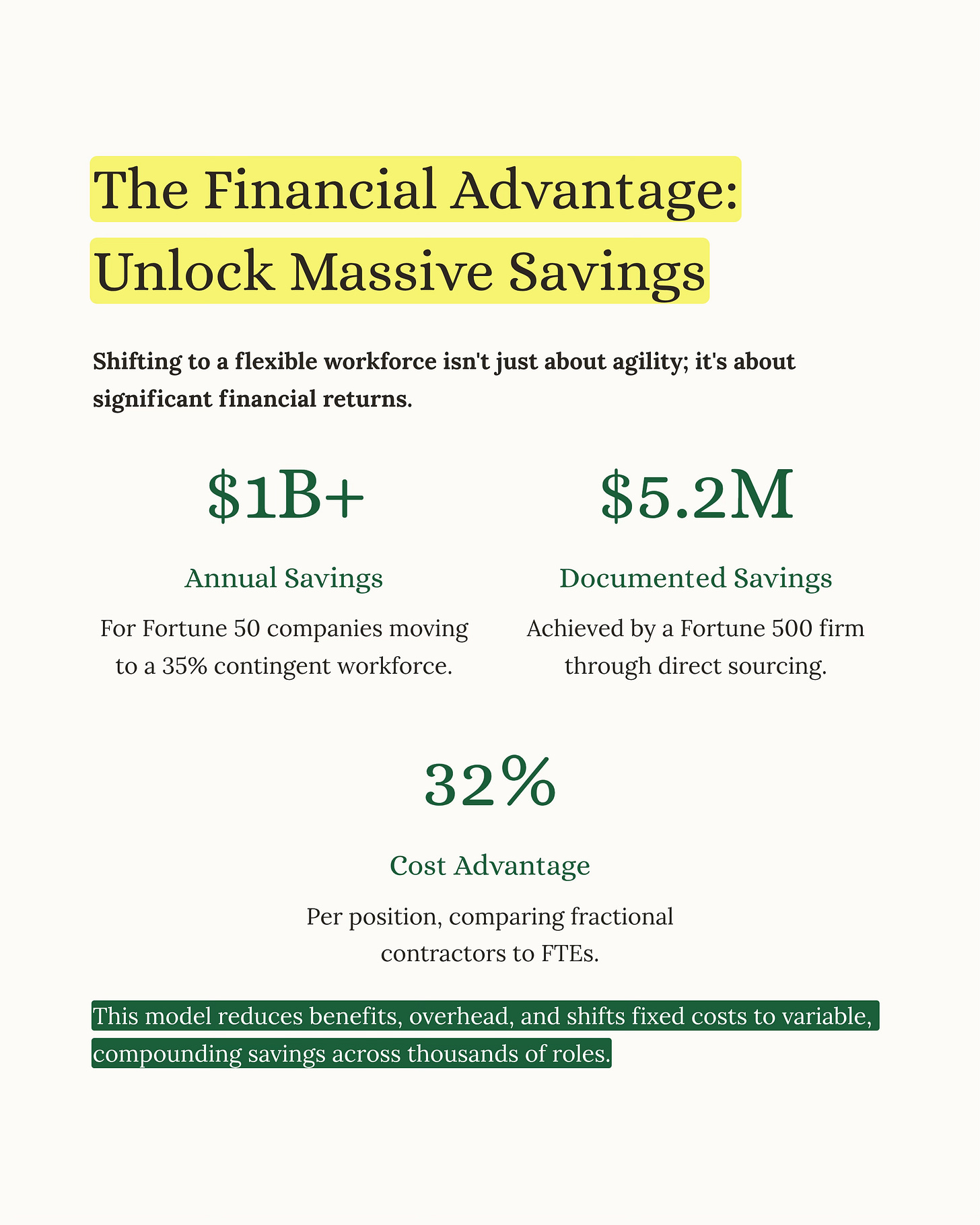 Permanent employees provide institutional knowledge, cultural continuity, strategic thinking, and depth of relationships. They’re essential for functions that require sustained engagement: leadership, core product development, key customer relationships, regulatory compliance. Contingent workers provide specialized expertise, variable capacity, diverse perspectives, and cost flexibility. They’re optimal for project-based work, cyclical demand, skill gaps, and innovation initiatives requiring external viewpoints. Where the work of a single role used to require 40 hours, and now requires less time commitment, this flexibility will become a requirement for enterprise decision-makers.