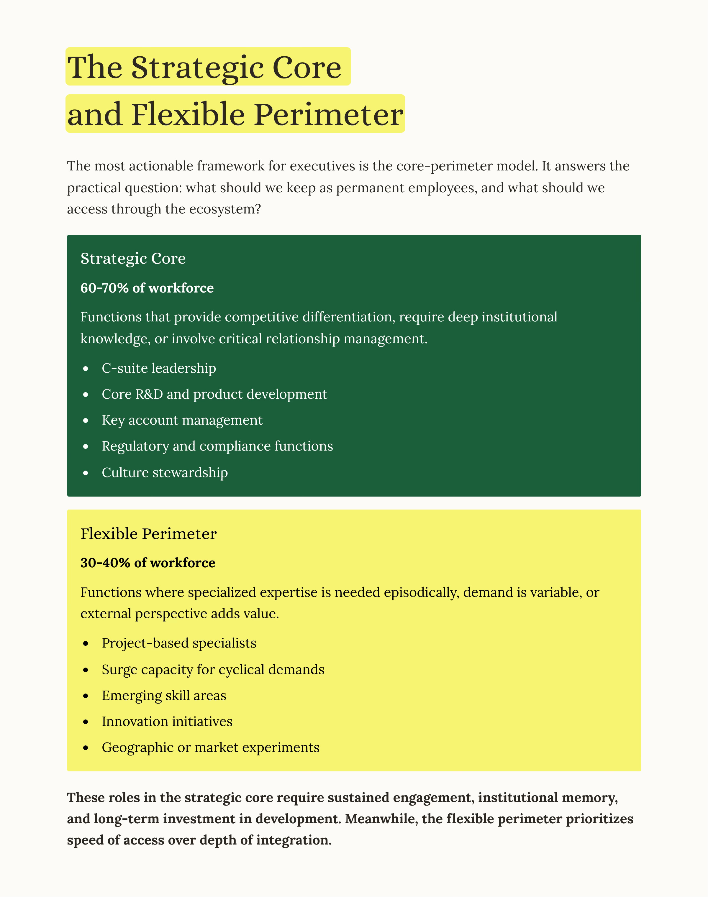 This ratio, roughly 60-65% permanent core, 35-40% flexible perimeter, appears consistently across leading enterprises. Harvard research confirms the pattern: organizations are deliberately shrinking their permanent headcount while expanding their access to external talent through platforms and contracting relationships.