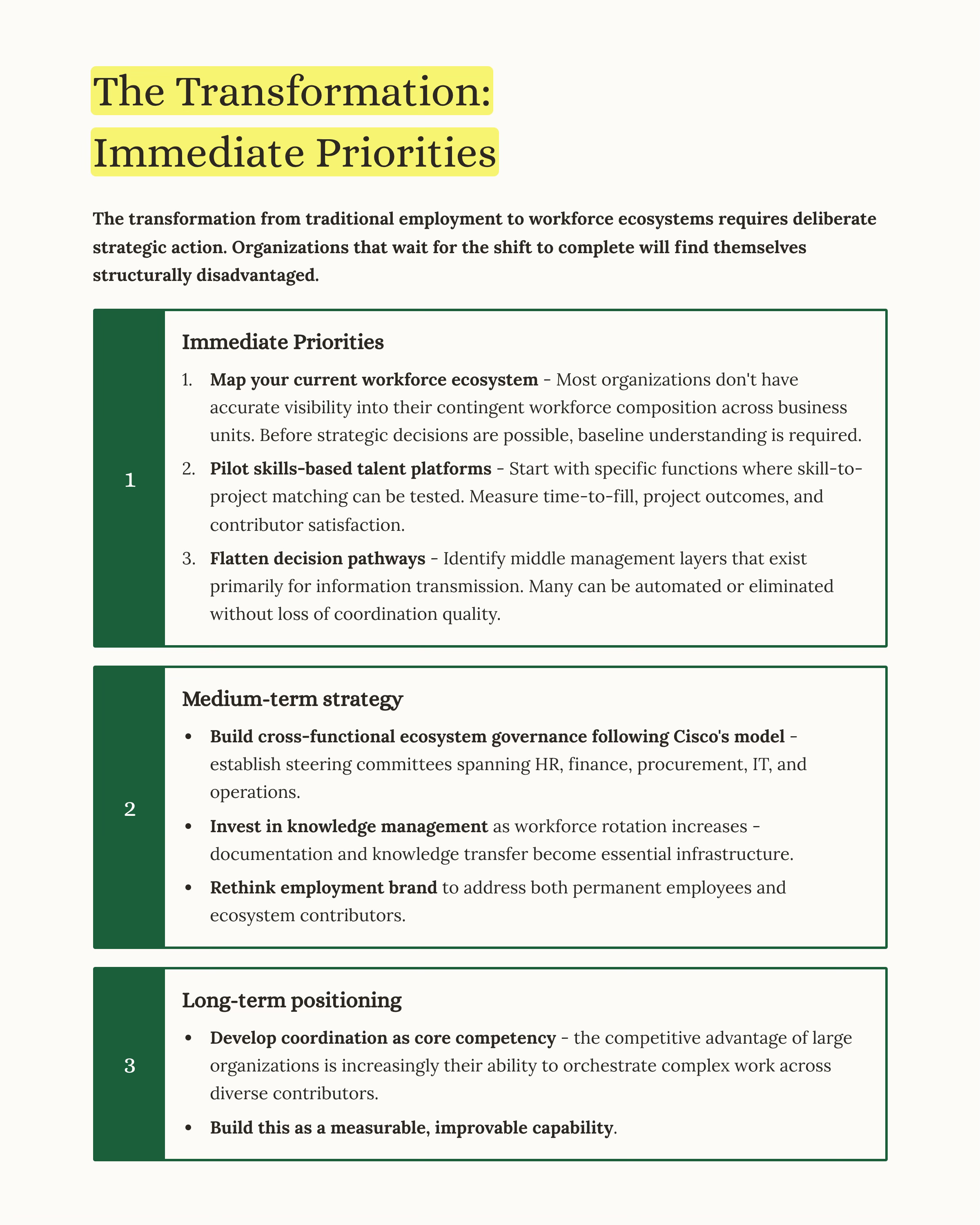 This actually favors large enterprises. Scale provides resources to invest in talent platform infrastructure. Brand provides credibility to attract ecosystem contributors. Network effects provide matching advantages that compound over time. BCG research on fractal organizations confirms that the organizations best positioned to win in a workforce ecosystem world are often the same large enterprises that dominated the traditional employment world, if they choose to adapt.