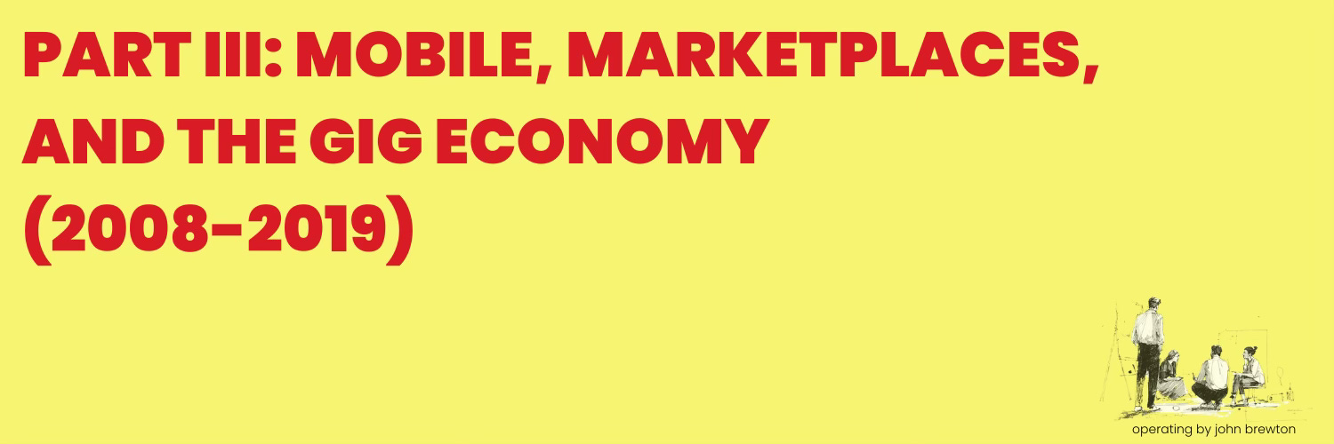 Part III: Mobile, Marketplaces, and the Gig Economy (2008-2019) - The iPhone and App Store create new operating systems for commerce and labor, as marketplace design becomes engineering and unit economics become standardized metrics.