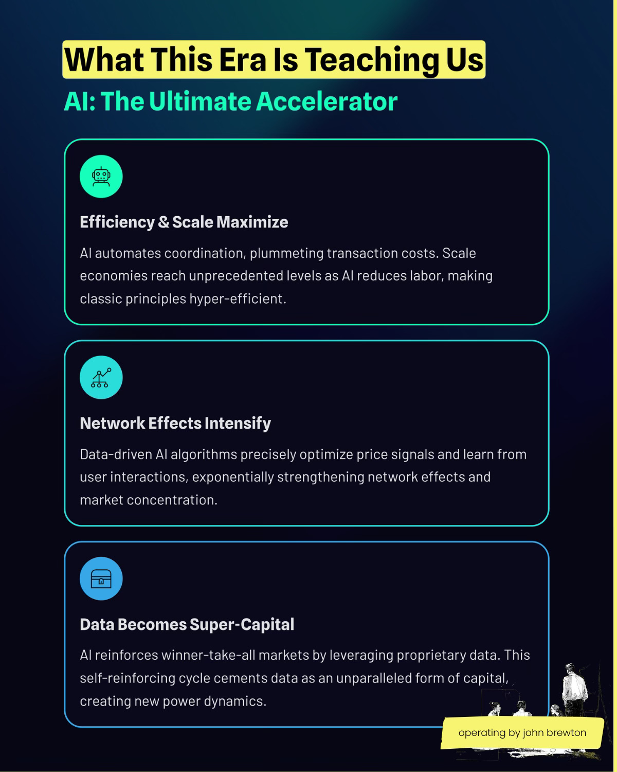 The companies that thrive will be those that master both the old rules and the new ones: minimize transaction costs while capturing network effects, optimize price signals while accumulating data capital, and achieve scale economies while navigating winner-take-all dynamics.