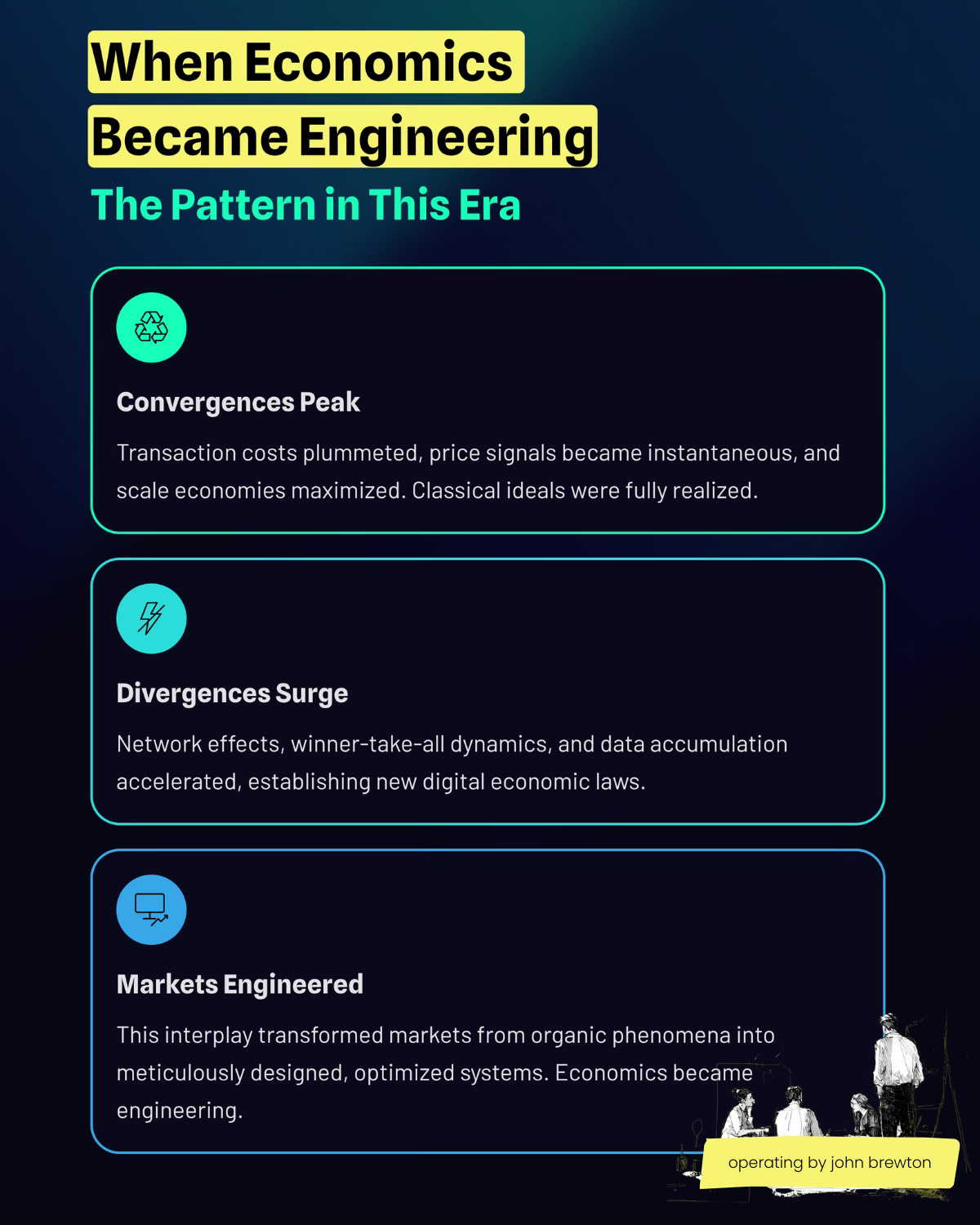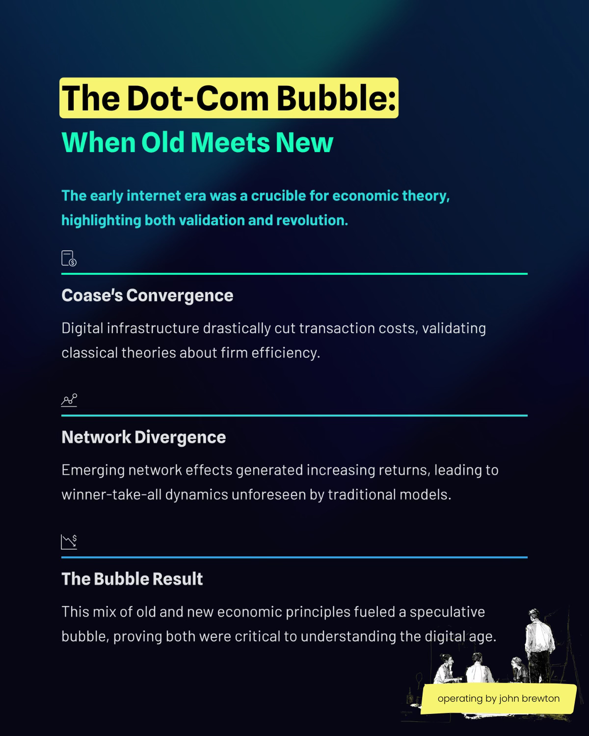 The 1990s proved classical economics still mattered. Companies that ignored transaction costs, unit economics, or basic profitability failed. But the era also revealed that network effects created dynamics classical theory couldn’t fully explain. Markets with increasing returns didn’t equilibrate, they concentrated. First movers gained compounding advantages. And pure efficiency didn’t guarantee survival; timing and network position mattered at least as much.