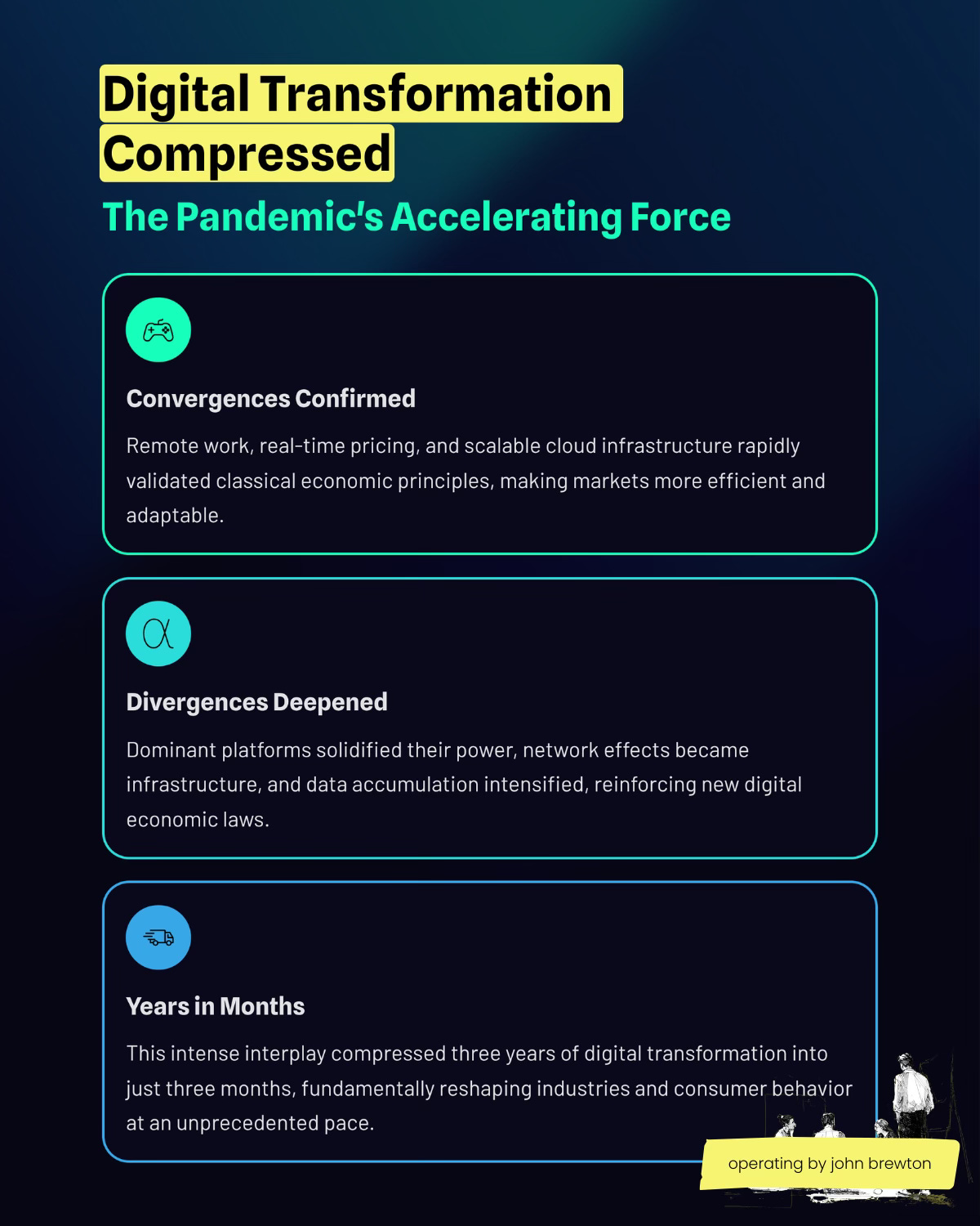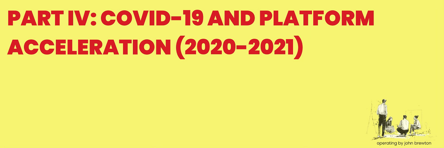 Part IV: COVID-19 and Platform Acceleration (2020-2021) - The pandemic compresses years of digital transformation into months, validating all three convergences and entrenching all three divergences as platforms become essential infrastructure.
