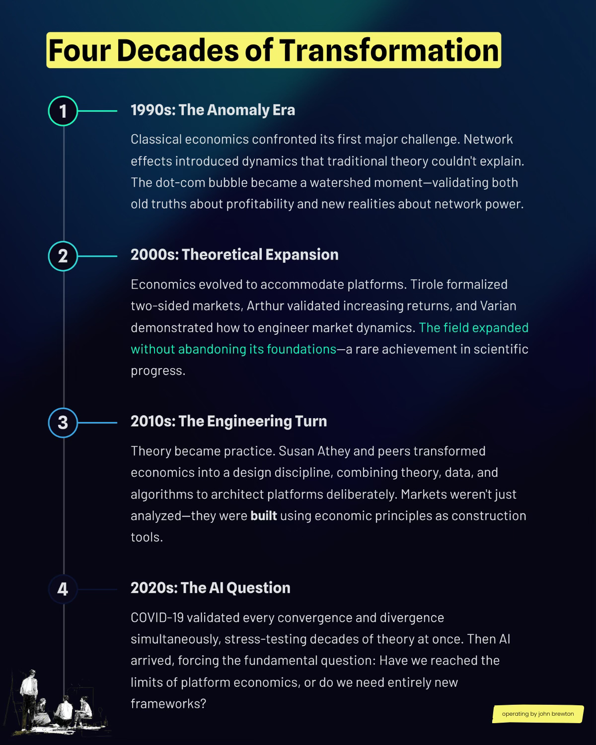 The economists who shape the next chapter will be those who design markets, not just describe them—who build tools for platform operators while expanding theory to accommodate AI, data, and whatever comes next.