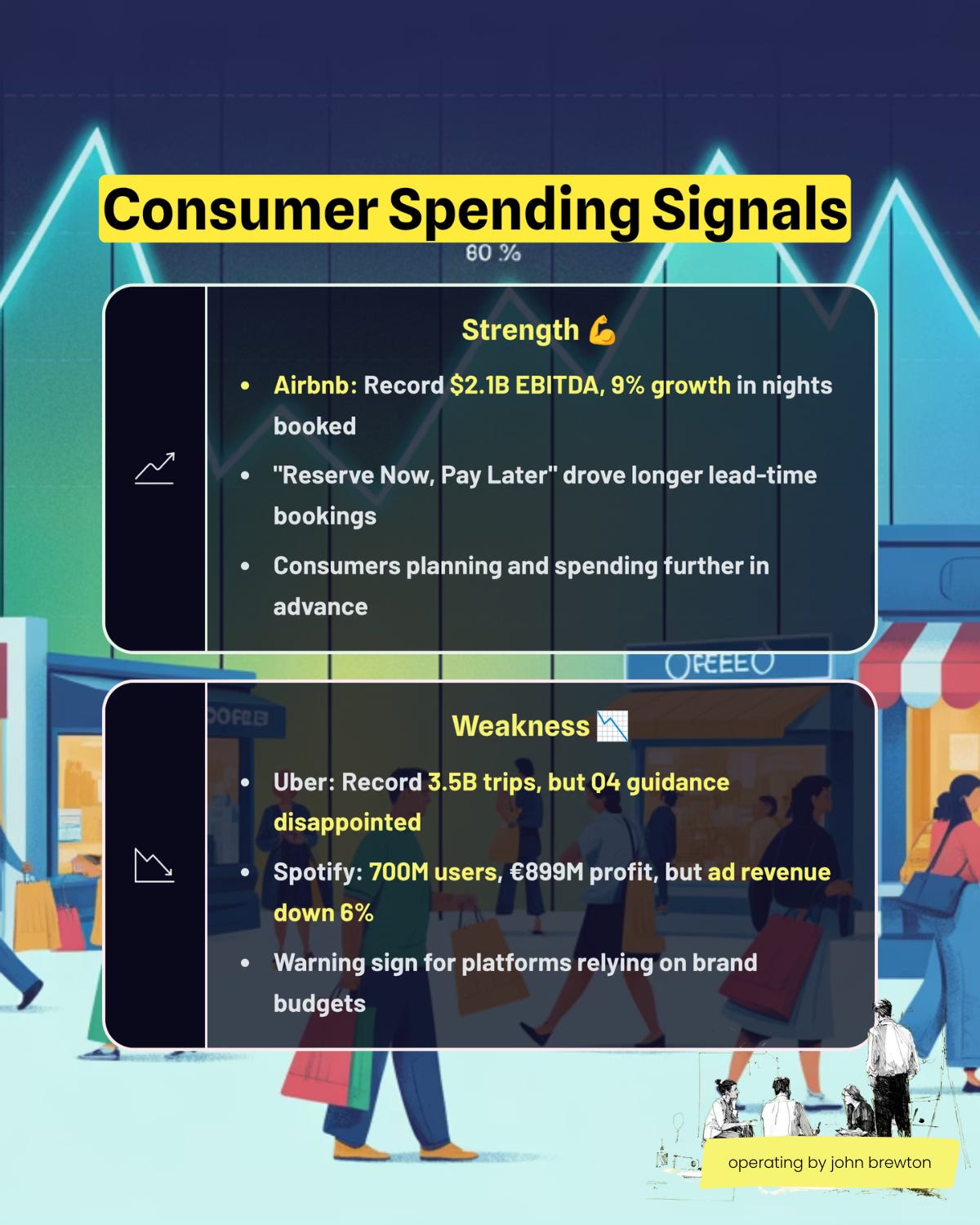 Airbnb delivered its highest quarterly EBITDA ever ($2.1 billion) on revenue of $4.1 billion (up 10%), with nights booked accelerating to 9% growth. The “Reserve Now, Pay Later” feature drove a surge in longer lead-time bookings, suggesting consumers are planning and spending further in advance than expected. For anyone reading travel as a leading indicator of consumer health, that’s encouraging.