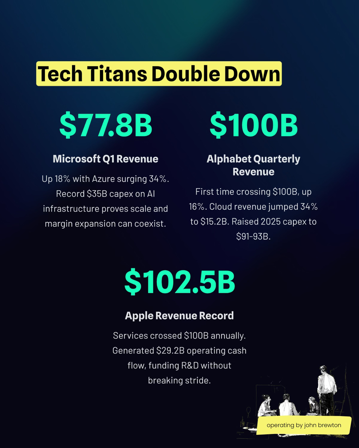 Microsoft posted Q1 FY2026 revenue of $77.8 billion (up 18%), with Azure revenue surging 34% as enterprise adoption of Copilot accelerated. The company spent a record $35 billion on capital expenditures—primarily data centers and AI chips and signaled that pace will continue. Operating income grew 24% to $38 billion, proving that at scale, AI spending can coexist with margin expansion.