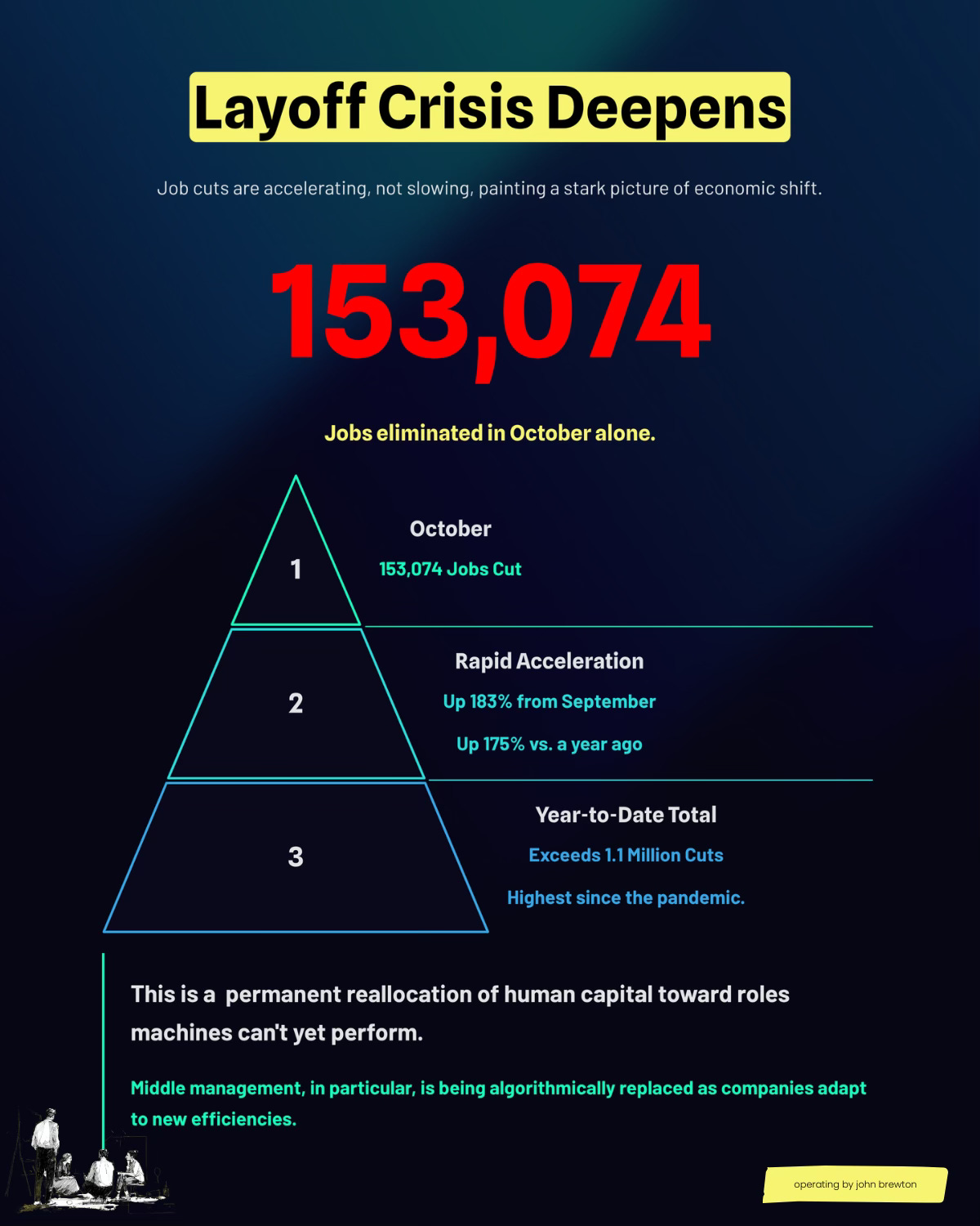 October witnessed the worst month for layoffs in 22 years: 153,074 job cuts, up 183% from September and 175% versus a year ago. Year-to-date cuts now exceed 1.1 million, the highest since the pandemic, and the trend is accelerating.