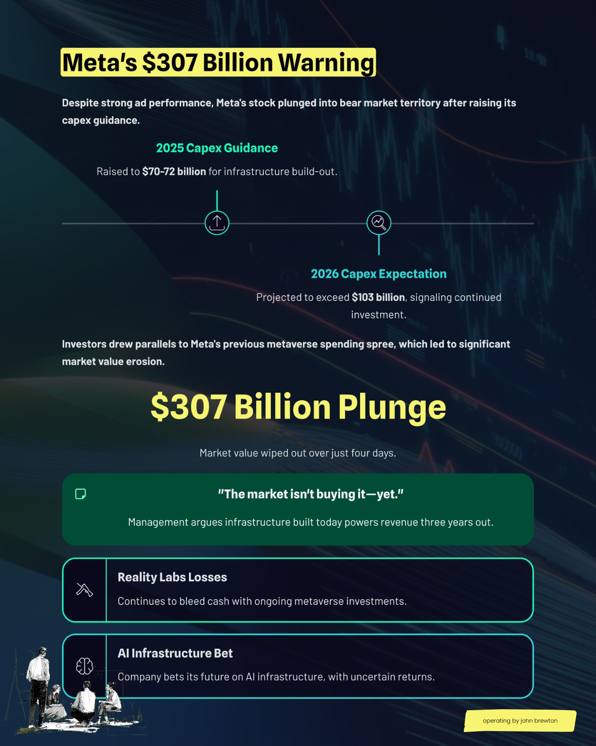 Meta saw its stock plunge into bear market territory despite strong ad performance, after raising 2025 capital expenditure guidance to $70-72 billion with expectations that 2026 could exceed $103 billion. Investors drew parallels to the metaverse spending spree, wiping out $307 billion in market value over four days. Reality Labs continues losing money, but management argues infrastructure built today will power revenue three years out. The market isn’t buying it—yet.