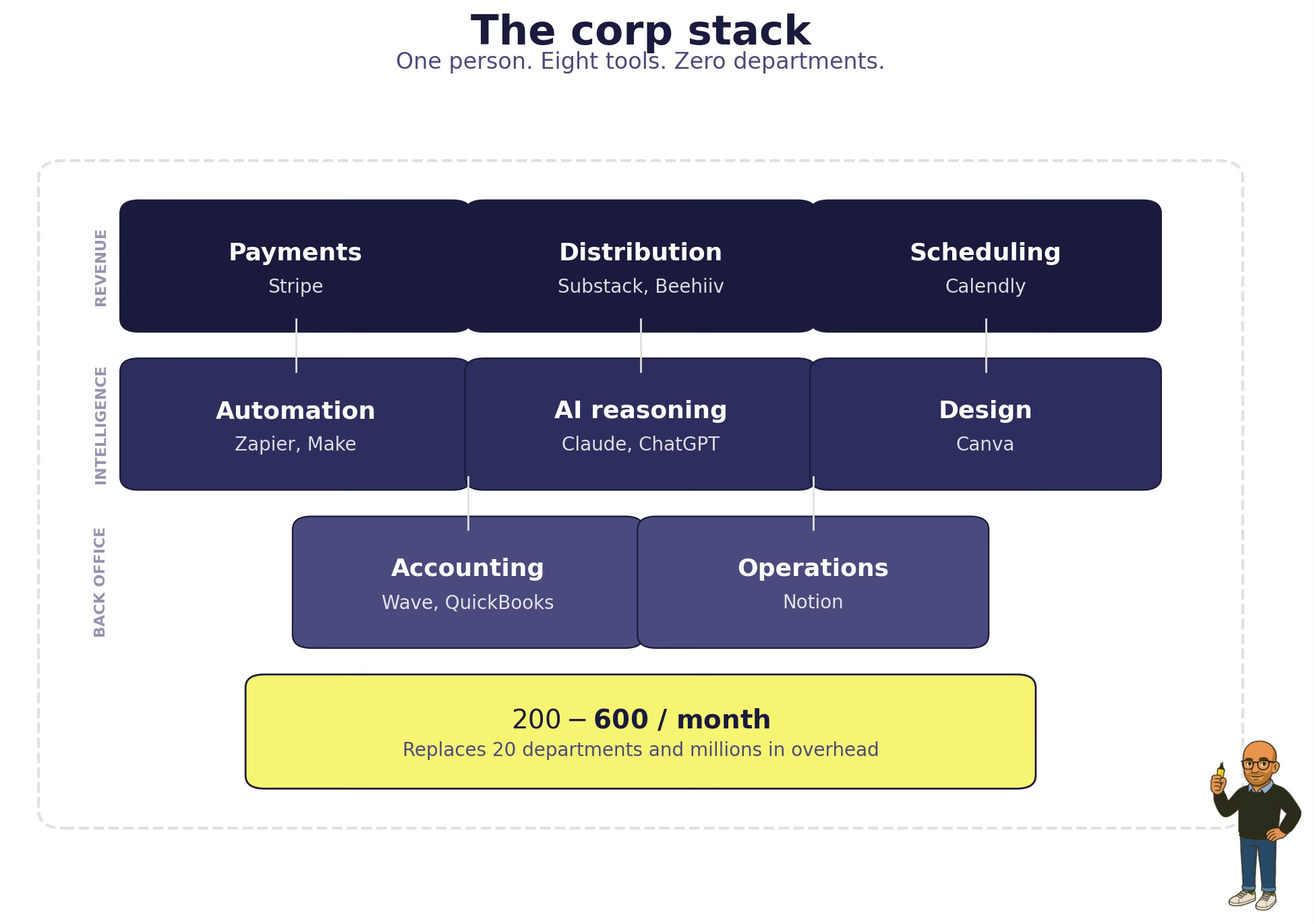 Your Corp Stack is your operating system. The decisions you make about which tools, which platforms, which revenue models, which distribution channels are not administrative details. They are strategic decisions. They are the modern equivalent of corporate strategy, made by individuals, every day, most of whom do not realize that is what they are doing.