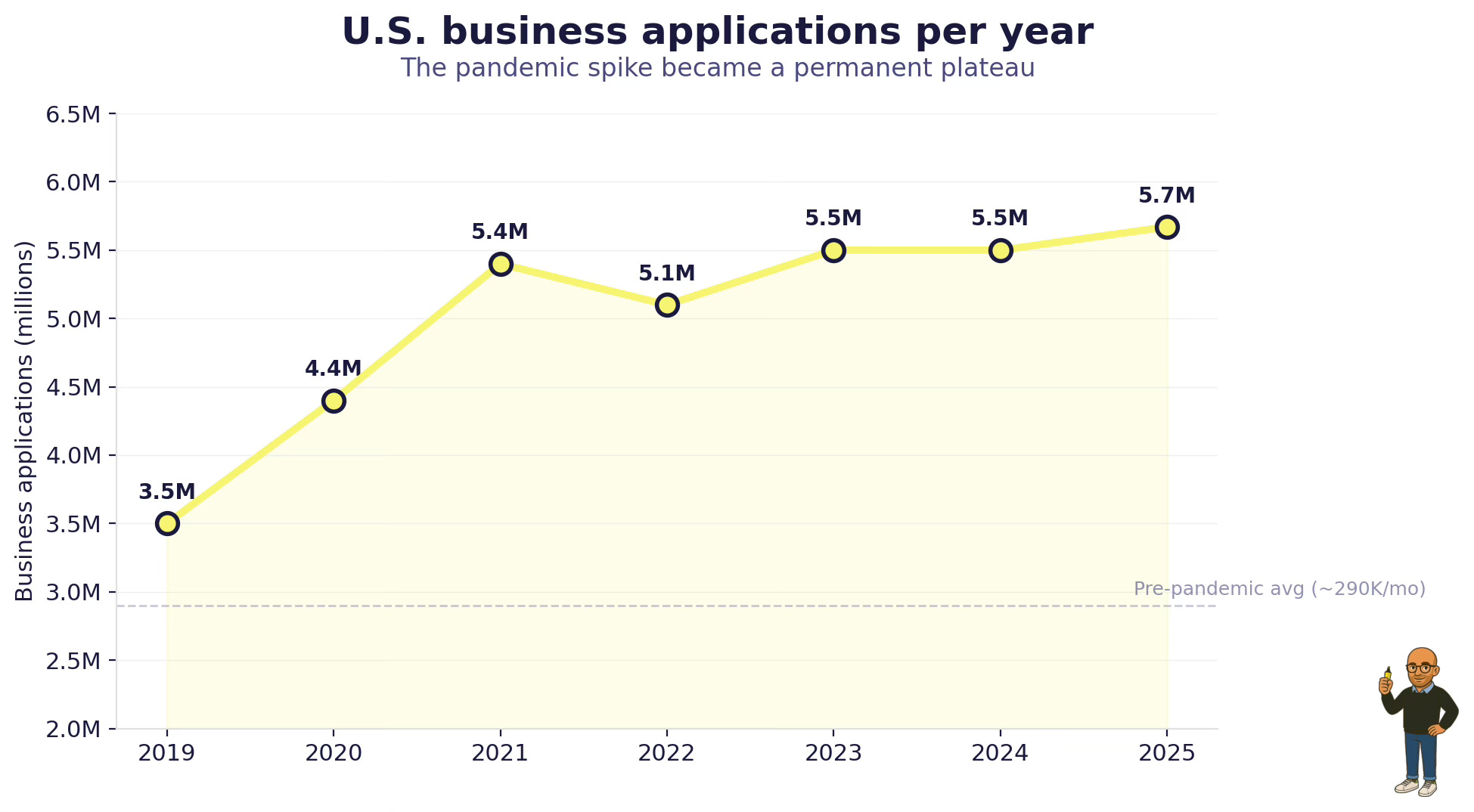 The SBA recorded 440,000 new business applications per month during the Biden administration, a rate 90% above pre-pandemic averages. In 2025, 5.67 million new business applications were filed. An all-time record.