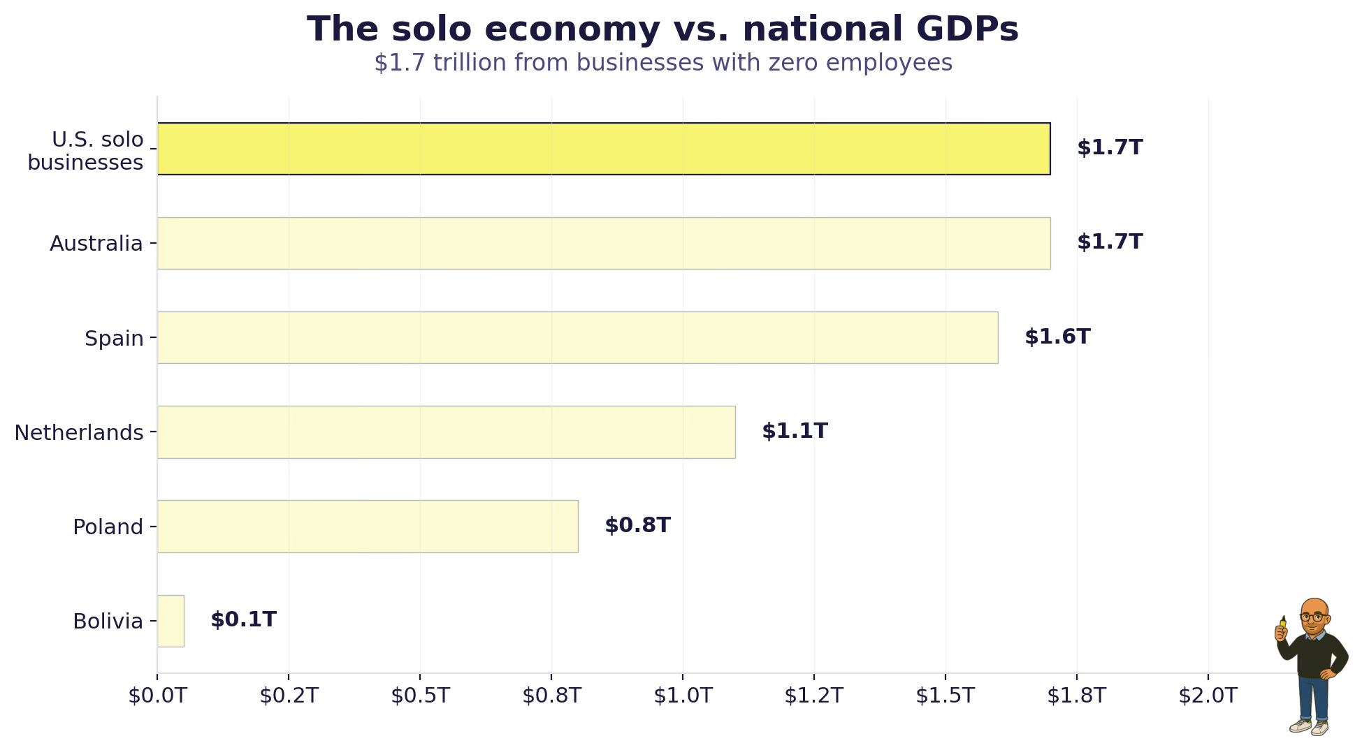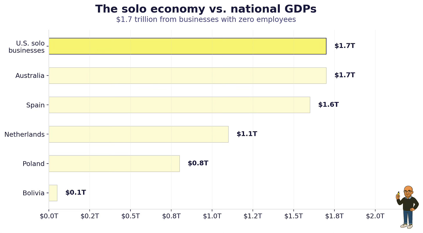 They collectively generate $1.7 trillion in annual revenue. That is the GDP of Australia. It is 6.8% of total U.S. GDP, produced by businesses with zero employees.