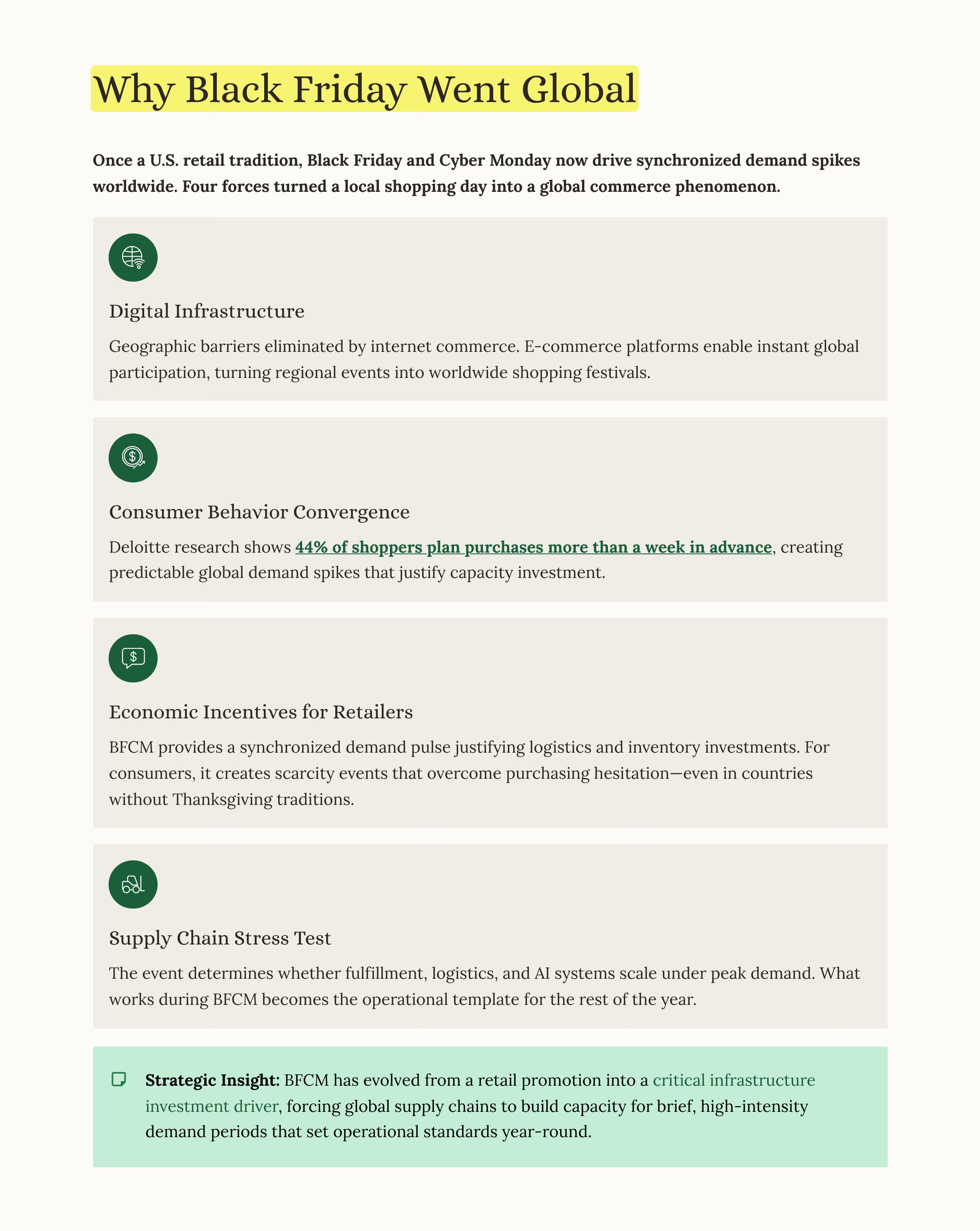 Companies that have won treat BFCM as an annual stress test for their entire supply chain architecture. What breaks during BFCM gets fixed the next year. What scales gets replicated. What works during peak becomes the template for the rest of the year.