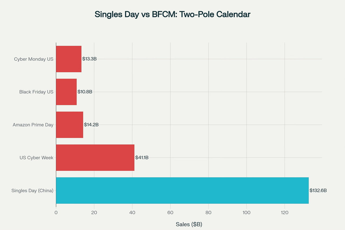 Singles Day (11/11) in China generated $132.6B in 2024, more than 5x the entire US Cyber Week ($41.1B). The emergence of two competing global shopping poles reflects the bifurcation of retail infrastructure, with Eastern commerce organized around Chinese platforms and manufacturing, and Western commerce centered on Amazon and US logistics networks.